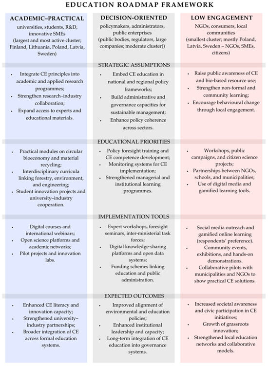 The Education Roadmap model (Figure 11) was developed to integrate insights from a stakeholder survey, K-means clustering analysis, and a review of educational content related to the CE within the forestry and bioeconomy sectors of the BSR. This model serves as a framework for developing competencies, promoting cooperation, and facilitating knowledge exchange among three stakeholder groups: academic-practical, decision-oriented, and low-engagement. An analysis of policy documents and educational strategies shows that CE education development in forestry is embedded in the European Union’s regulatory framework. Three strategic documents significantly influence this: the Circular Economy Action Plan (2020) [46], which, under the European Green Deal, emphasises integrating circular principles into environmental and vocational education; the EU Bioeconomy Strategy [47], which supports the sustainable use of biological resources and the development of skills for innovation and circularity; and the EU Strategy for the Baltic Sea Region-Policy Area Bioeconomy [48], which offers a collaborative platform for educational cooperation across the region.