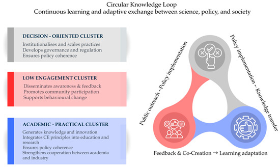 Conceptual model of the circular knowledge loop illustrating the interaction between academic-practical (blue), decision-oriented (grey), and low engagement (red) clusters within the Education Roadmap framework.