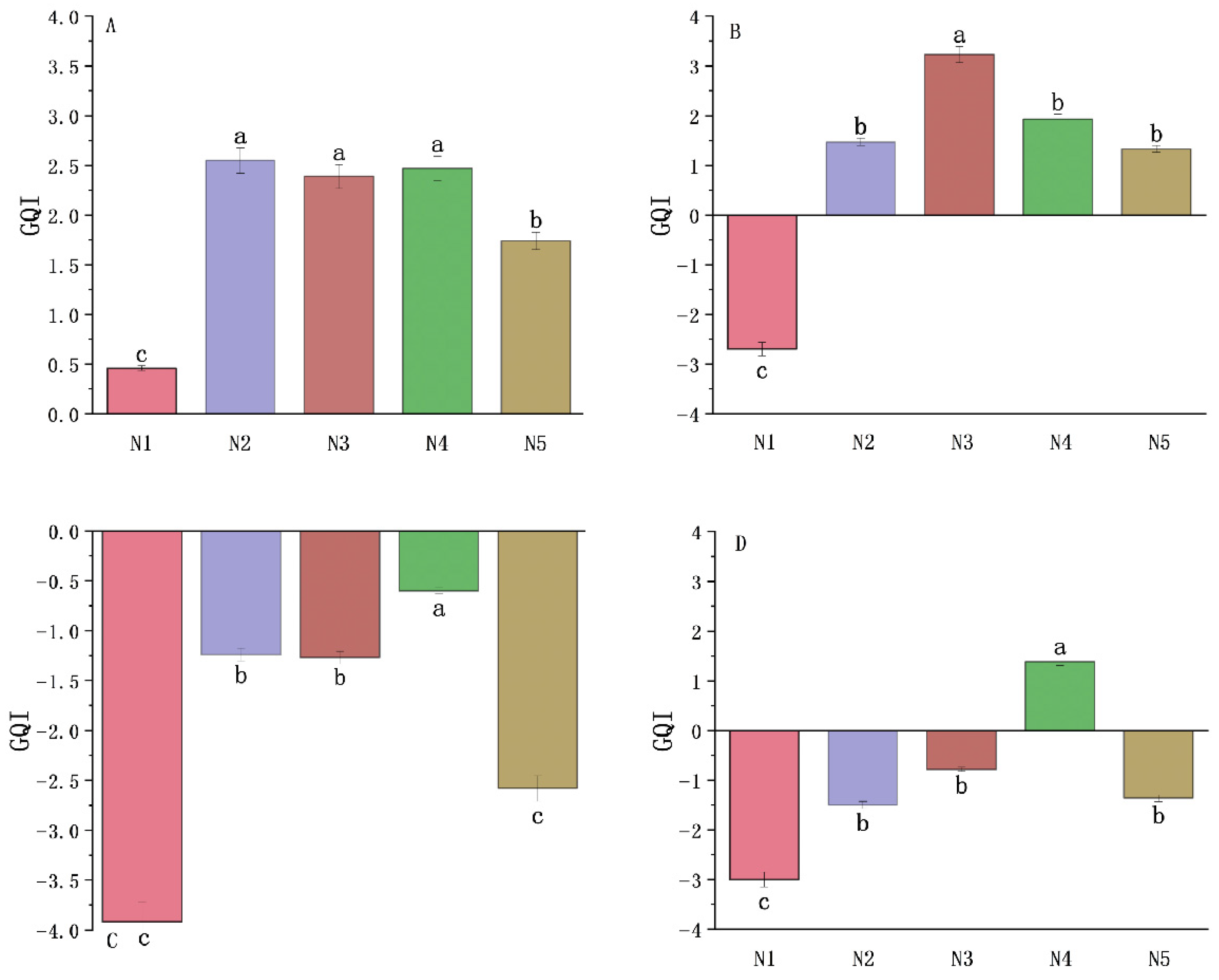 3.1.3. Effect of Nitrogen Fertilizer Operation on GQI