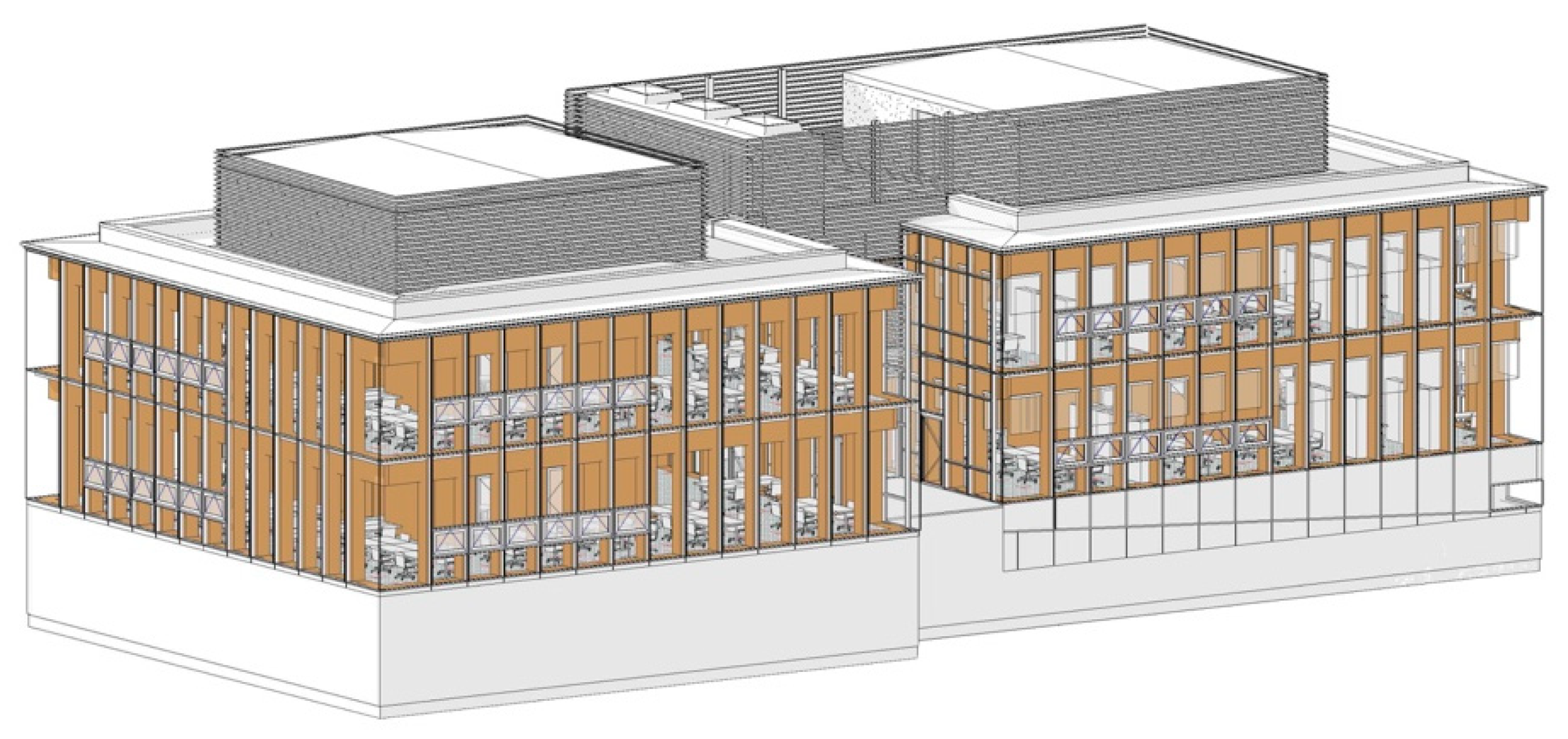 In the case of the Cross Laminated Timber structure variant, it was assumed that reinforcing bars with 90% recycled steel content would be used in the required reinforced concrete elements of the basement and above-ground and that the proportion of Portland clinker in the concrete mix would be reduced by 50% through the use of CEM III cement. In addition, it was assumed that some of the reinforced concrete walls, ceilings and columns would be replaced with CLT structure.