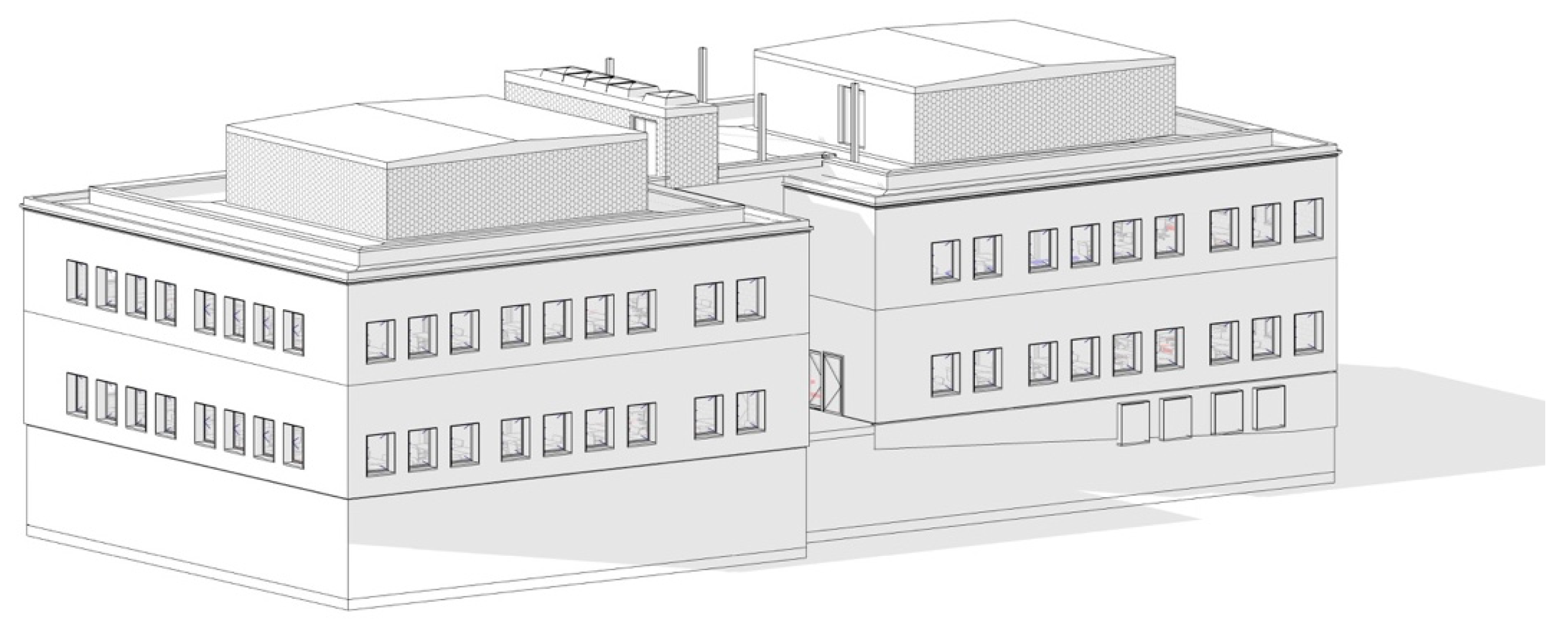 For the purposes of this study, a building with a precisely made digital model was selected, the level of detail of which enabled accurate take-offs regarding the quantity and type of construction products and materials used in it. The building model was made using BIM (Building Modeling Information) technology in Autodesk Revit. The use of BIM technology and appropriate material classification at this stage allowed for an efficient preliminary take-off of the quantity of materials that make up the building. The prepared model allowed for the assembly of building parts in various configurations, such as the structure, façade, and internal arrangement elements. At the stage of creating the model, each component of the building was assigned an appropriate parameter regarding the material classification in accordance with the BREEAM UK classification, which allows for direct import of data from Autodesk Revit in the form of an appropriately grouped list of materials to the One Click LCA program. An analysis of the built-in carbon footprint was performed in the One Click LCA program. One Click LCA was selected as a tool validated by multiple sources and compliant with ISO 14040/14044 [