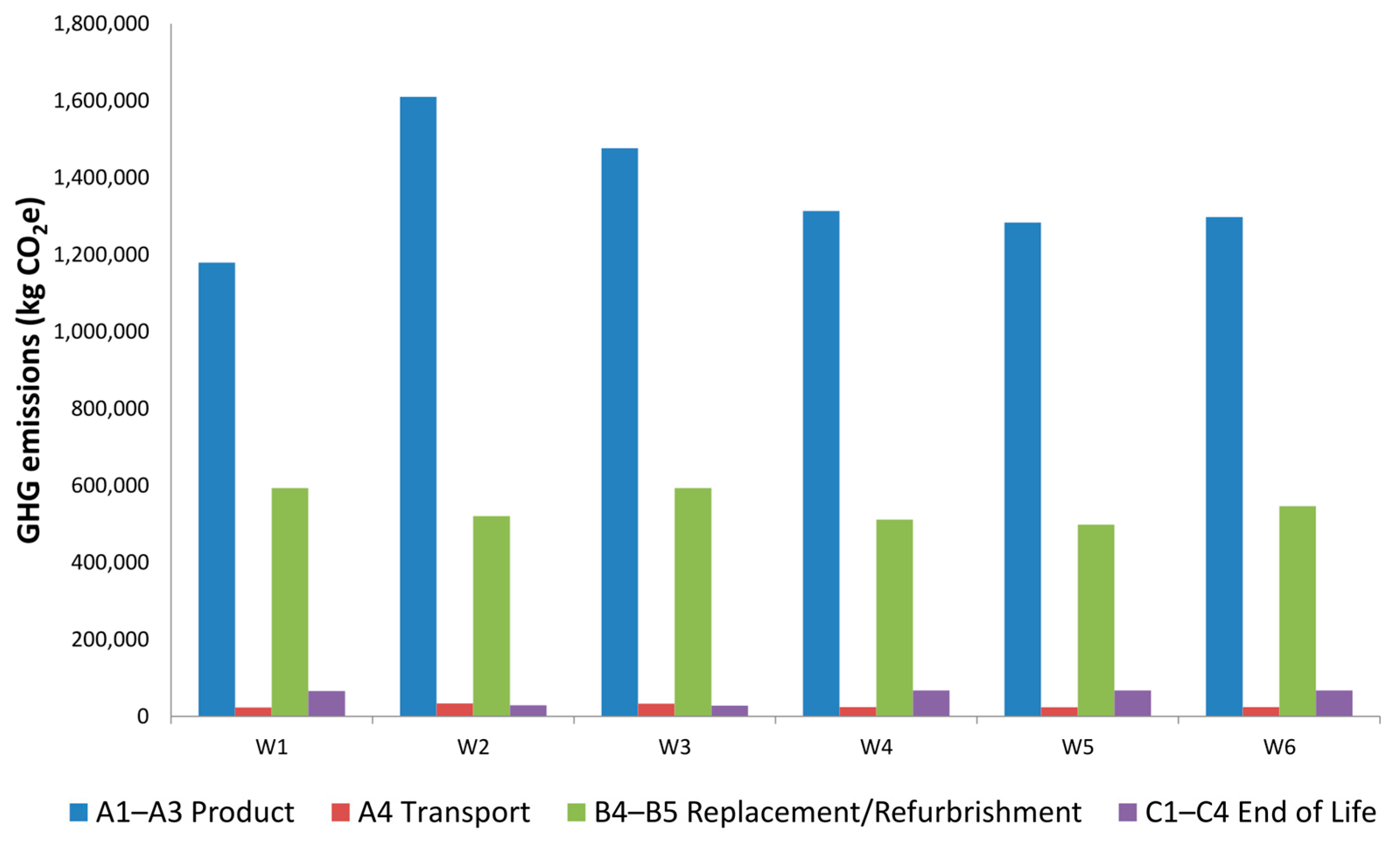 Figure 5, it can be deduced that the highest GHG emissions are characterized by phases A1–A3 related to material production. For this phase, the most favorable results were achieved by the “W1” building variant, which is a building with a CLT structure and a system glass facade. However, it has the highest emissions for phases B4–B5 related to the replacement of building components. This has to do with the assumption made in the calculation regarding the replacement of the system glass facade after 35 years. It affects the additional emissions associated with the production of replacement components. Other assumptions were made for masonry facades, whose lifespan was assumed to be the same as for the entire building.