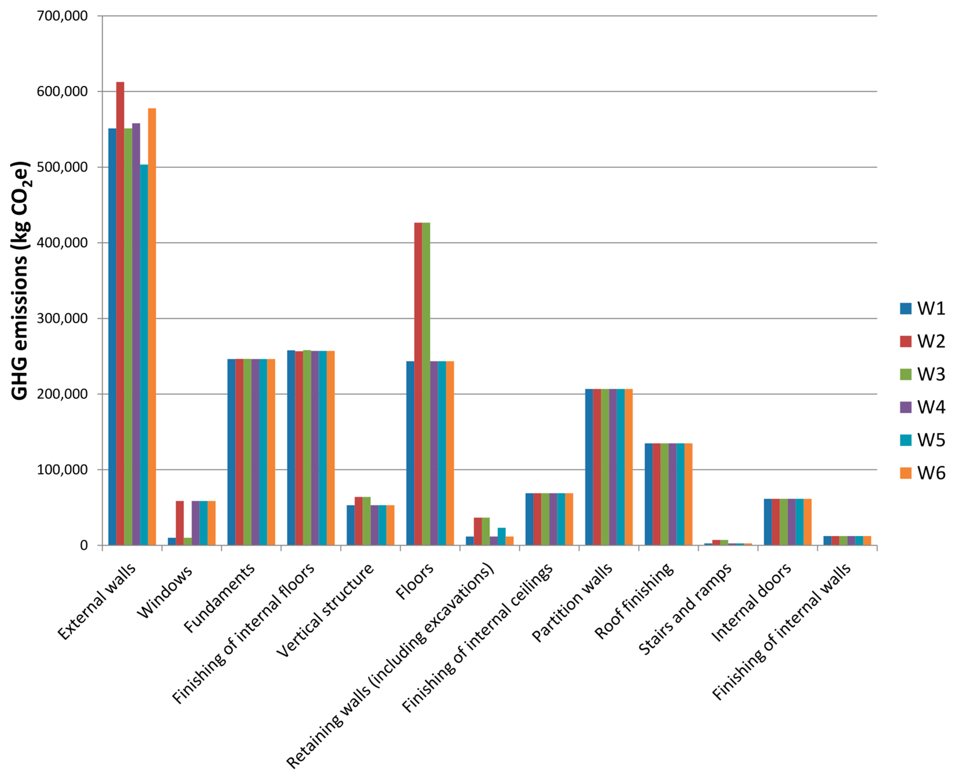 The building elements that have the greatest impact on global warming are the external walls, which consist of their structure, casing and finish. The ventilated façade with fiber–cement board cladding on a massive, masonry curtain wall, i.e., variant W5, achieved the best results in relation to the external walls. Variants W1 and W3, which were proposed as a system glass façade on a steel and aluminum substructure, achieved better results than other façades made of masonry. The next largest emitters are the foundations, internal floor finishes and ceilings between stories. In the case of variants W2 and W3, reinforced concrete ceilings emit almost 2 times more kg CO2e than wooden ceilings used in other construction variants. Interior finishing elements, such as floor coverings and partition walls, are certainly important considerations. Their relatively short life cycle, which is on average 5–15 years, with a large material volume at the same time, causes an increase in kg CO2e emissions related to the phase of replacing elements with new ones. It is worth bearing in mind that not only the amount of materials used is important in the case of calculating the carbon footprint—an equally important parameter is the time after which the replacement of building components takes place. In this study, it was assumed that the main structure of the building would function for as many years as the entire building, but in the case of the façade, a scenario was adopted that the materials would be replaced after 35 years. For interior finishing elements, it was assumed that they would be replaced after 15 years, and for thermal, damp-proof and waterproof insulation after 30 years.