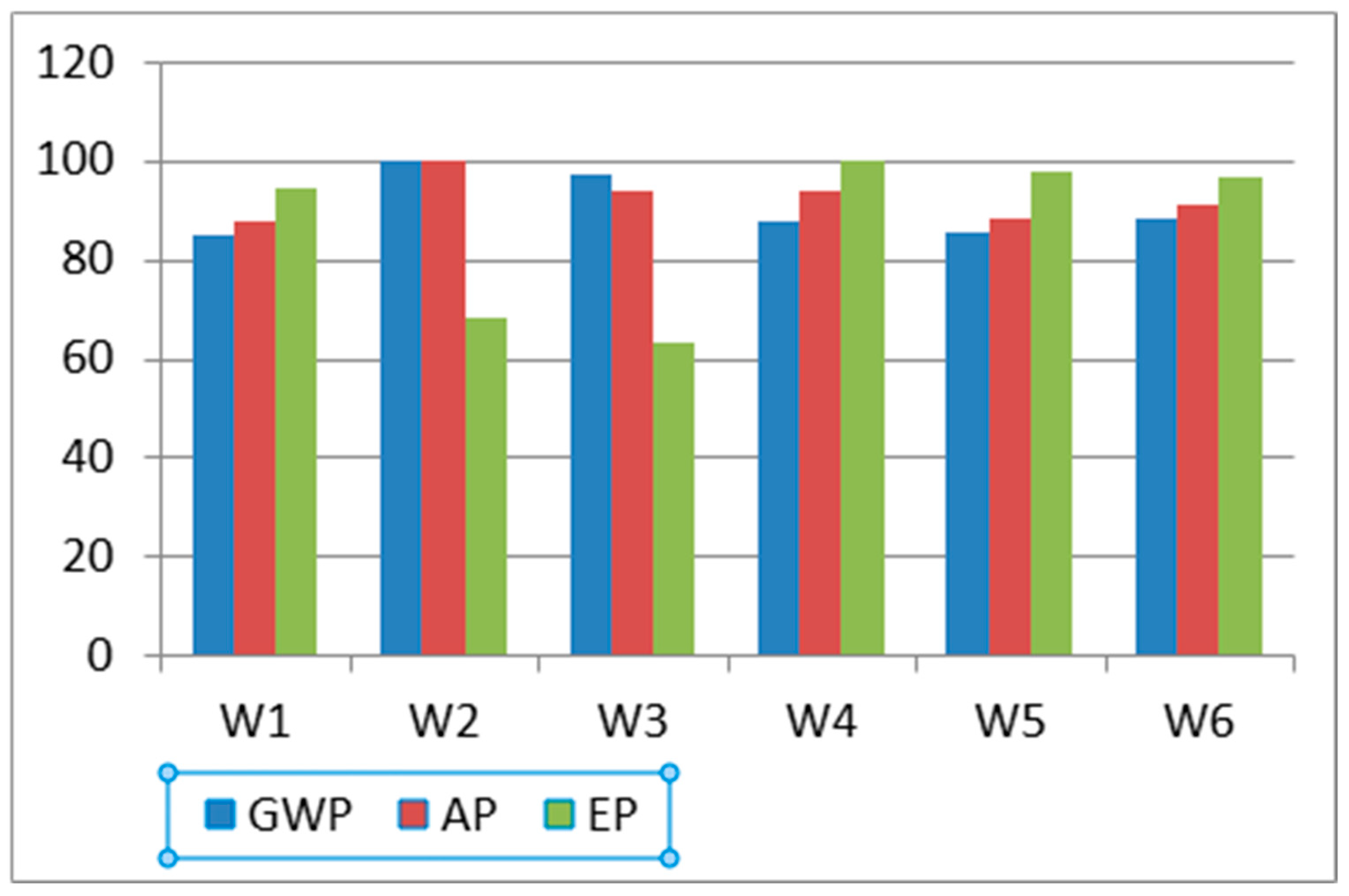 The first variant has the lowest impact on the GWP and AP categories, but in the EP category, concerning the eutrophication potential, it performs worse than variants W2 and W3. Buildings W2 and W3 achieve the most optimal results in this category, because they use a reinforced concrete structure, and in the other cases a wooden one. The main cause of eutrophication of reservoirs is the excess of nitrogen and phosphorus, which increases water fertility. These elements largely come from agricultural sources, because very large amounts of them are found in fertilizers and animal excrements [