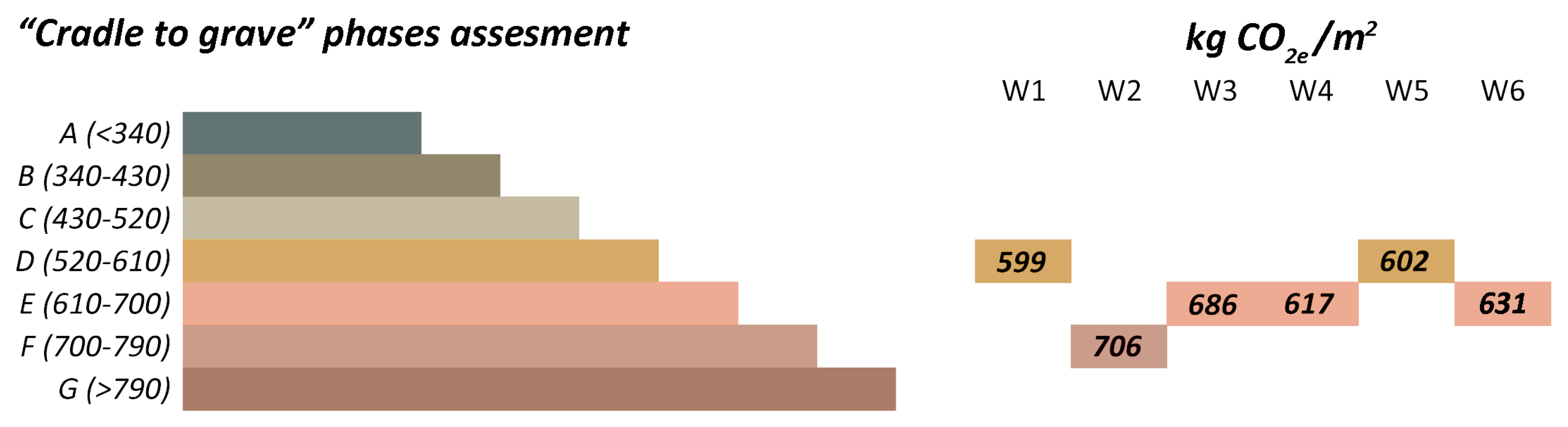 In the case of the W1 variant, the building achieved a result of 599 kg CO2e/m2, while the W5 variant achieved 602 kg CO2e/m2. They thus gained a “D” rating in the “cradle-to-grave” category. However, the difference between the most optimal option W1 and the least favorable option W2 differ by 107 kg CO2e/m2 (about 15%).