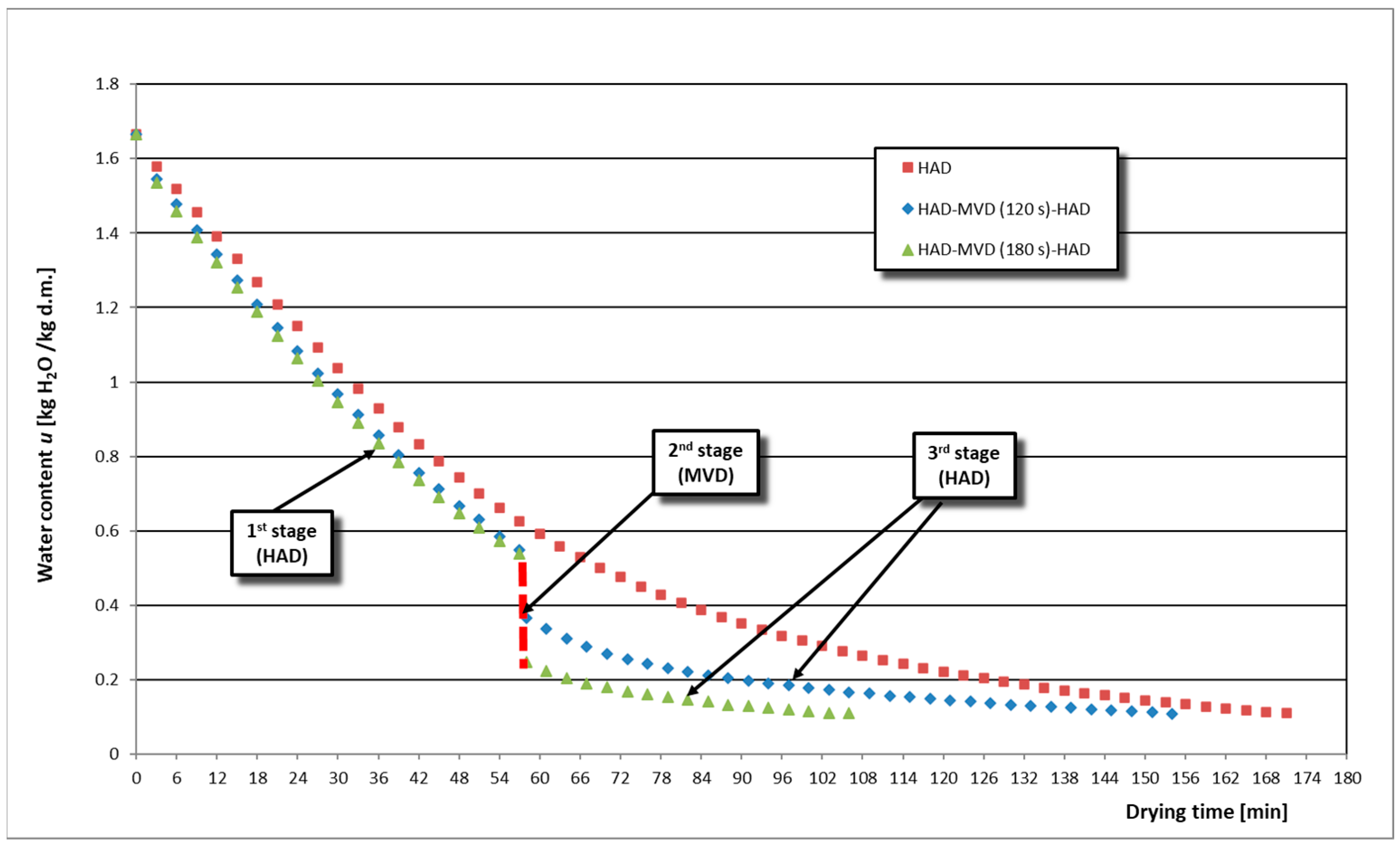 v = 1.4 m/s in the 1st and 3rd drying stages (HAD) were selected for presentation. In the 2nd drying stage (MVD), two process durations were presented for wild boar meat: 120 and 180 s at a constant microwave power of 650 W, and for red deer meat, two different microwave powers: 650 and 1300 W at a constant process duration of 120 s. Each drying curve shown in