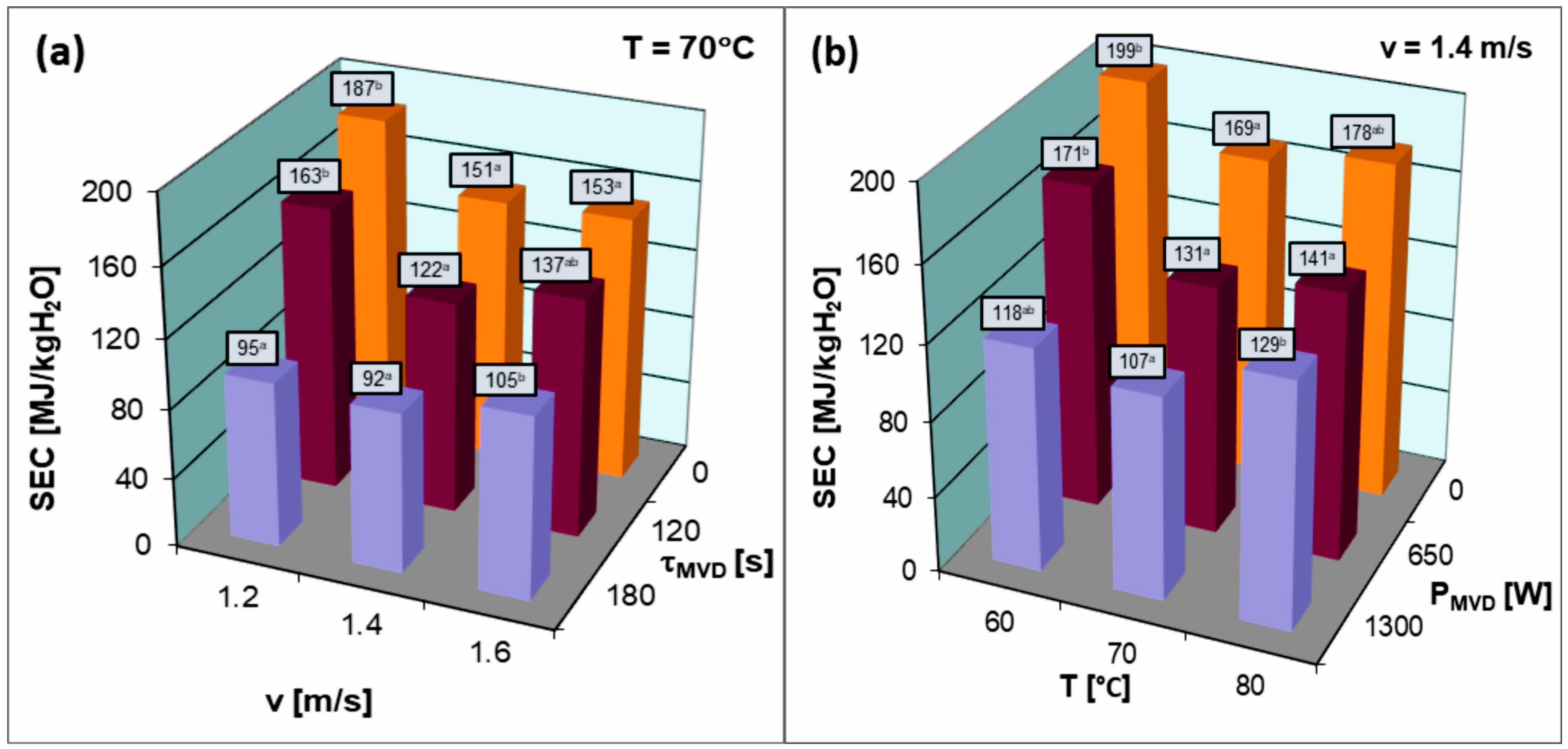 Regarding the different conditions of the second stage of drying (MVD), it is clearly visible that the use of this drying stage reduces the SEC of the entire process regardless of the conditions used. However, both a longer MVD time (
