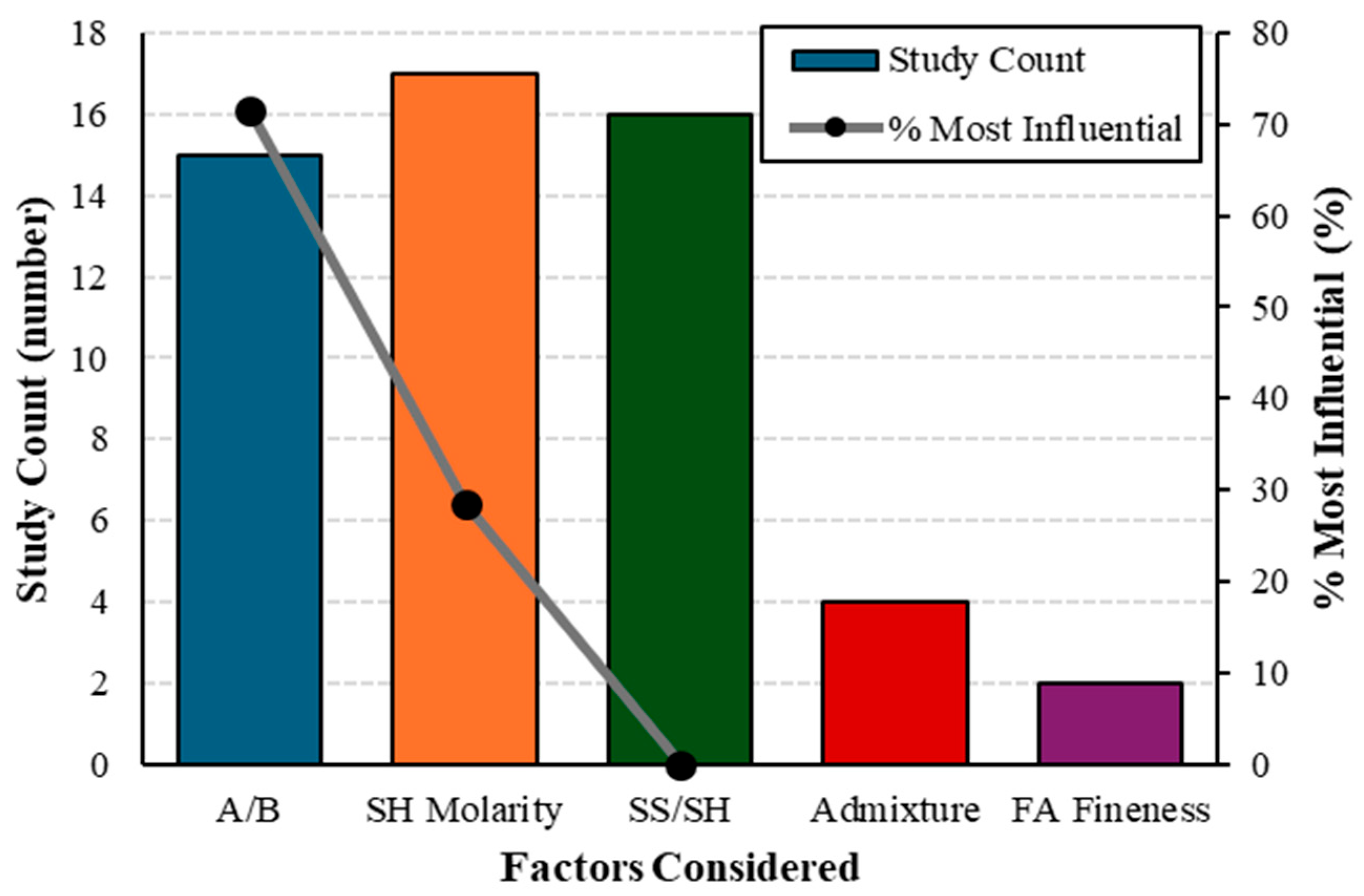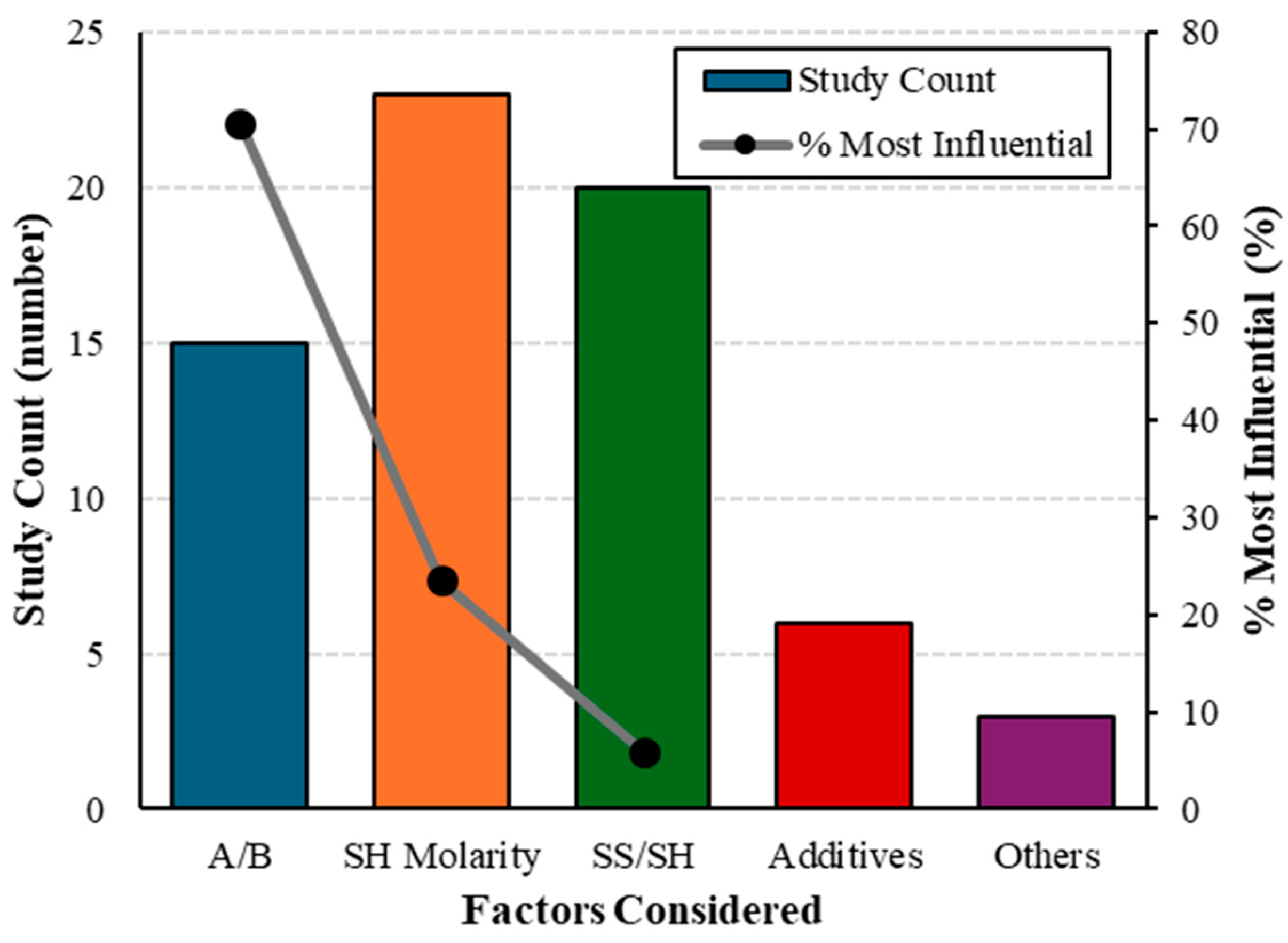 - Optimizing GPC mix design through precise control of A/B and SS/SH ratios for given precursors is crucial to achieving net-zero carbon goals while ensuring high-performance standards. Future studies should focus on a systematic approach that tailors A/B and SS/SH ratios based on the specific precursors used to enhance workability, strength, and durability.