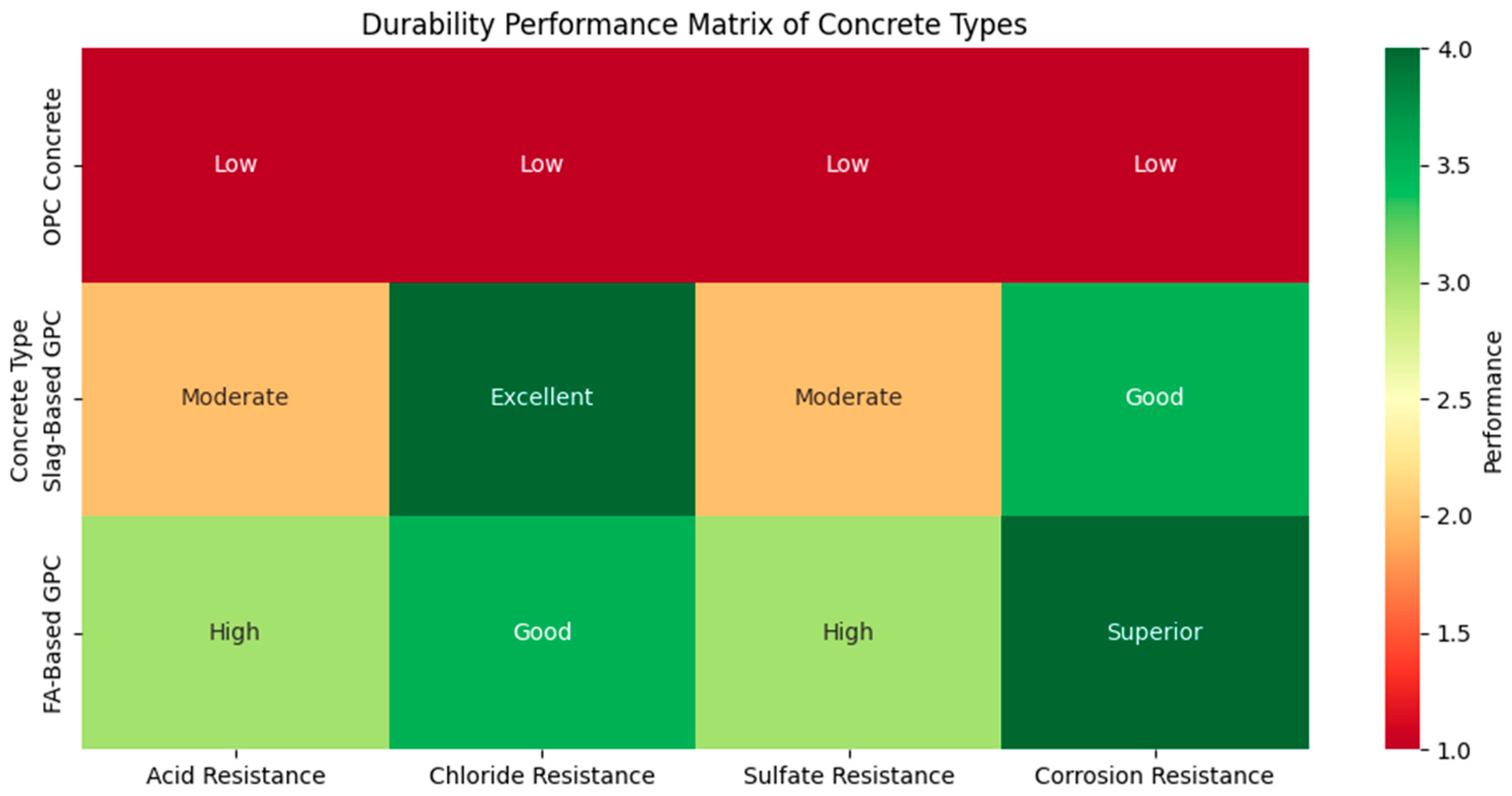 - GPC exhibits superior resistance to acids, chlorides, sulfates, and corrosion compared to OPC concrete, owing to its aluminosilicate-based matrix that limits the formation of expansive degradation products. The durability of GPC is closely tied to its microstructural composition, and blending high- and low-Ca precursors can enhance its performance in aggressive environments. This strategic approach not only improves long-term durability but also supports the goal of achieving net-zero carbon GPC.