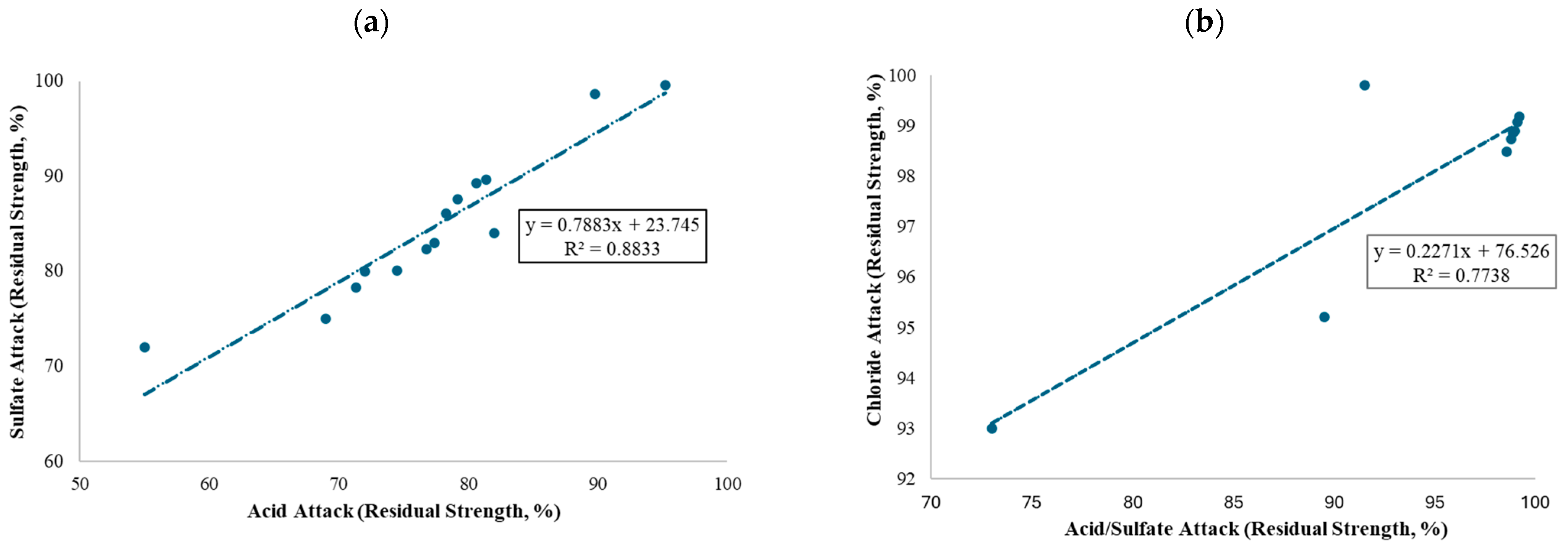- Singh, R.P.; Vanapalli, K.R.; Jadda, K.; Mohanty, B. Durability assessment of fly ash, GGBS, and silica fume based geopolymer concrete with recycled aggregates against acid and sulfate attack. J. Build. Eng. 2024, 82, 108354. [Google Scholar] [CrossRef]