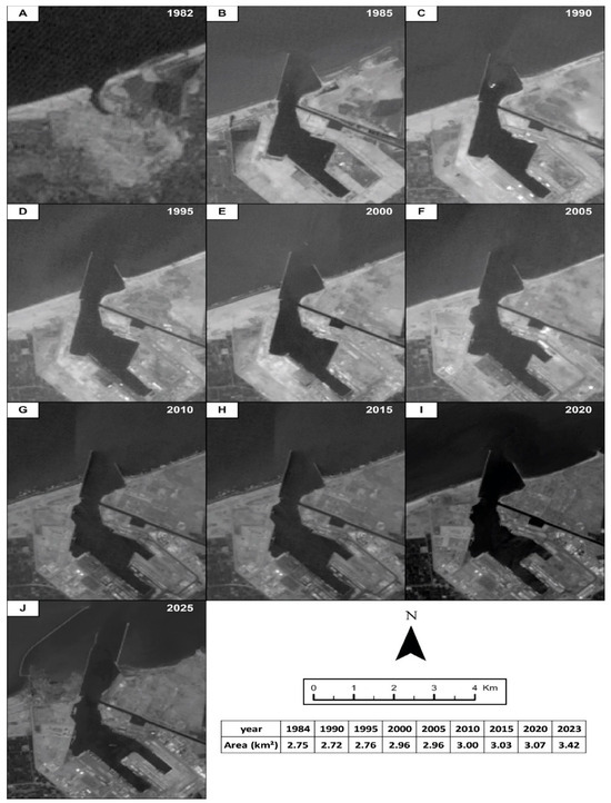 Time-series Landsat satellite imagery (Bands 2 from Landsat 4, 5, and 8) illustrating the historical morphological and infrastructural development changes of DH from 9 October 1982, to 13 March 2025. The images highlight significant changes including port excavation, construction and extension of jetties, development of the navigation channel, progressive land reclamation, and harbor infrastructure expansion. Figures (A–J) illustrate the temporal variations in the conditions of the DH.