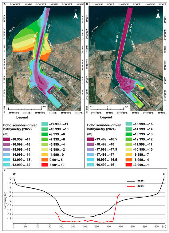 Echo-sounder-derived bathymetry maps of DH in 2022 (A) and 2024 (B). (C) W–E cross-sectional profile along DH-Navigation channel shows the change in bathymetry between the two surveys.