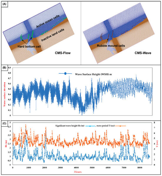 (A) CMS modules details. (B) Water surface elevation (2018). (C) Wave data (2014).