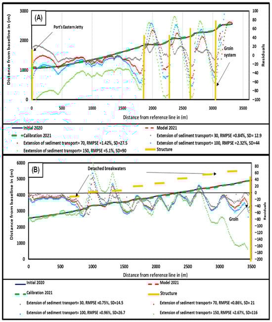 The lowest computed RMSPE, according to the calibration approach using RMPSE data, is 0.84% and 0.75% for the two zones, respectively. The lowest computed SD is 15 m and 14.5 m for the two zones, respectively. The RMSPE and SD values appear relatively low compared with long-term geomorphological studies due to the one-year calibration period, during which the shoreline variability was limited. Standard deviation quantifies the spread of the residuals (i.e., the differences between modeled and observed values) and reflects how consistently the model can replicate real-world behavior. These values are for 30 m of the extension of the sediment transport table and may be used as a setting for tuning to measure shoreline variations. The calibration findings utilizing the 2020 shoreline observation at a value of 30 m extended transport table at zone 1 are displayed in Figure 7A. With an average rate of 4.5 m/yr, the model can accurately predict severe accretion rates. It can also accurately anticipate erosion behavior, with an average rate of −3.7 m/yr and a maximum pace of −15 m/yr. These rates are entirely comparable to those determined from 2021 measured data and DSAS coastline change rates from Landsat images. Additionally, Figure 7B displays the final calibration findings in zone 2. In the shaded area of DBWs, the model accurately predicted severe accretion rates with an average of 2.25 m/yr and a maximum of 12 m/yr; erosion behavior was also accurately predicted with an average of −2.9 m/yr and a maximum of −14 m/yr. Additionally, these rates are completely comparable to those determined from the 2021 measured data and DSAS shoreline change rates from Landsat images. Similar observations were mentioned in [54].