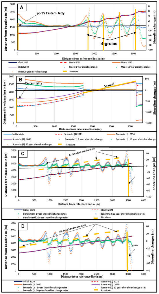 Scenarios shoreline prediction in 2021, 2030, 2040 divided into two parts 3300 m for each shown as (A) represents first 3.3 km, (B) represents scenario 1 and (C) represents last 3.3 km of the model, (D) represents scenario 2.