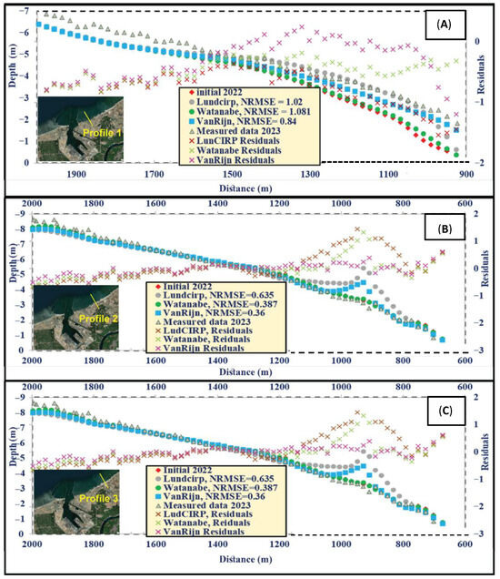 The CMS-Wave half-plane model was adopted for this simulation. The CMS model was calibrated for DH and the surrounding ocean area using bathymetry maps to 2022 (Figure 1D). The model was run to predict the bottom change one year later, from 2022 to 2023, after the wave and flow mode input data were specified. To perform sensitivity analysis and model calibration, three profiles in the vicinity of DH were examined. Important among the considered calibration variables are manning coefficients (0.01, 0.025, and 0.04) and a number of sediment transport equations (Lund-CIRP, Van Rijn, and Watanabe). A comparative study was carried out at DH profiles 1, 2, and 3 in 2022 for a one-year simulation in order to emphasize the disparities between measured and anticipated profiles in 2023. The model is highly qualified to predict coastal morpho-dynamic processes by calculating the Normalized Root Mean Square Error (NRMSE) for each profile, as shown in Figure 9. It has a Manning coefficient of 0.01, a d50 of 0.2 mm, a 400 s time step, a scaling factor of 2.0, and an adaptation length of 20 m.