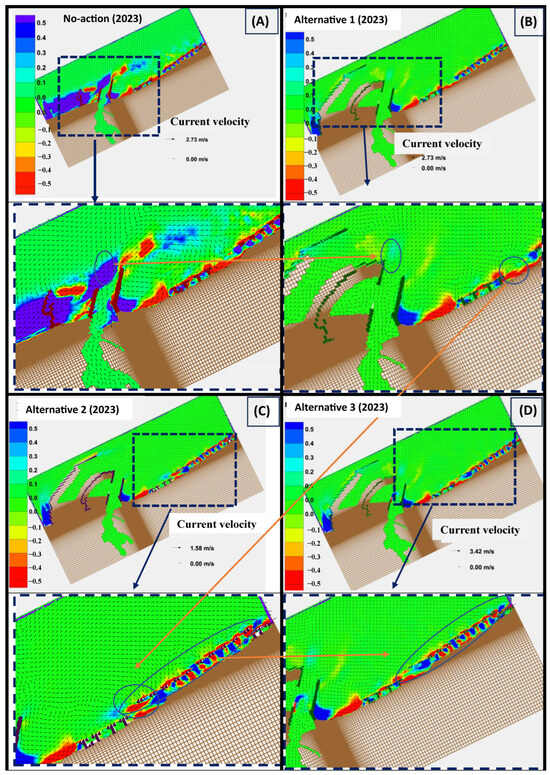Morphology changes and current velocity for (A) No-action, (B) Alternative 1, (C) Alternative 2, (D) Alternative 3, (E) Alternative 4, (F) Alternative 5 in 2023.