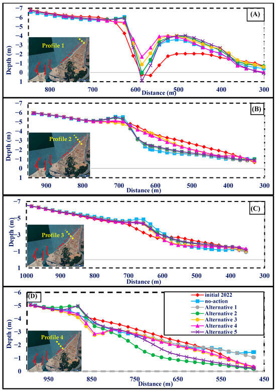 Overall, morphological changes across all proposed alternatives, including erosion patterns and sediment deposition, are summarized in Figure 10, highlighting the varying effects on shoreline stability. Four detailed profiles along Ras El-Bar beach (Figure 11) were strategically selected to provide further insight into morphological alterations under Alternatives 2, 3, and 4. These profiles corroborate the finding that these structures play a critical role in maintaining shoreline integrity. It is evident from the cross-shore bed profiles in Figure 11 that, for Profiles 1–3, the initial 2022 and no-action scenarios nearly overlap in most alternatives. In fact, Profile 2 experienced ample coastal erosion, but profile 1 had an accretion pattern in each of the suggested alternatives. The original forms of the coastline profiles in Profile 3 were preserved in all options. In contrast, Profile 4 shows a much stronger response; Alternative 2 and, to a lesser extent, Alternatives 4 and 5 show net erosion with a distinct downward displacement of the bed relative to the initial 2022 and no-action profiles, with the latter two being the highest, indicating that significant stability endures in the current circumstances. Table 2 provides detailed information on the cumulative eroded and accreted zones at the zones behind detached breakwaters along the Ras El-bar coast.