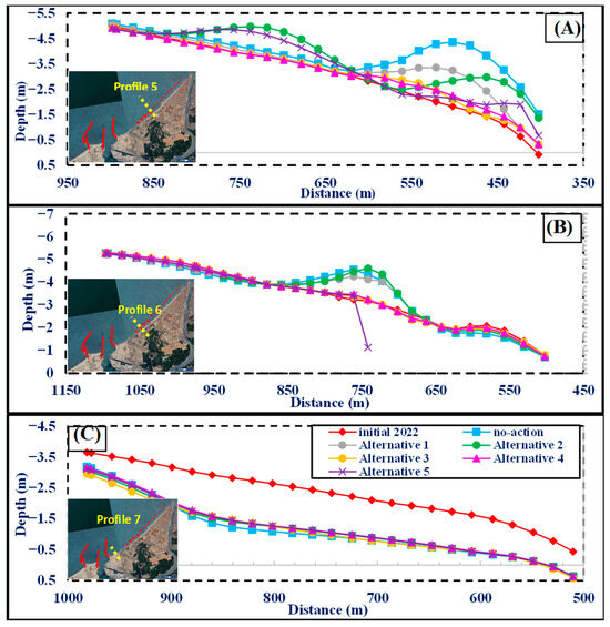 Alternative 5 entails filling in the gaps between the current groins with sediment before building a seawall. Although the findings indicate that this intervention would not have an apparent impact on shoreline dynamics, it does provide a considerable economic opportunity by recovering a sizable portion of land that would be used for a projected tourism development project (Figure 10F). The three profiles that are shown in Figure 12 all exhibited the same outcomes. Erosion predominated in all considered alternatives inside Zone 1, with minor variations among them. In Zone 2, as illustrated in Table 2, situated between the groin system and the offshore breakwaters, the volume of eroded sediment was −147,180 m3 under the benchmark case. This amount significantly decreased to −67,491.4 m3 in Alternative 1. In Alternative 2, sediment accumulation increased to +604.457 m3, further rising to +7967.1 m3 in Alternative 3, which represented the maximum accumulation. However, in Alternative No. 4, erosion occurred again, resulting in −6670.95 m3, followed by a sediment accumulation of +1482.12 m3 in Alternative 5. The benchmark value for the accumulated sediment in Zone 3 was +60,432.8 m3. This quantity decreased in Alternative 1 to +21,083.5 m3, while in the other alternatives, sedimentation turned into substantial erosion, with Alternative 3 recording the greatest value at −14,970.1 m3.