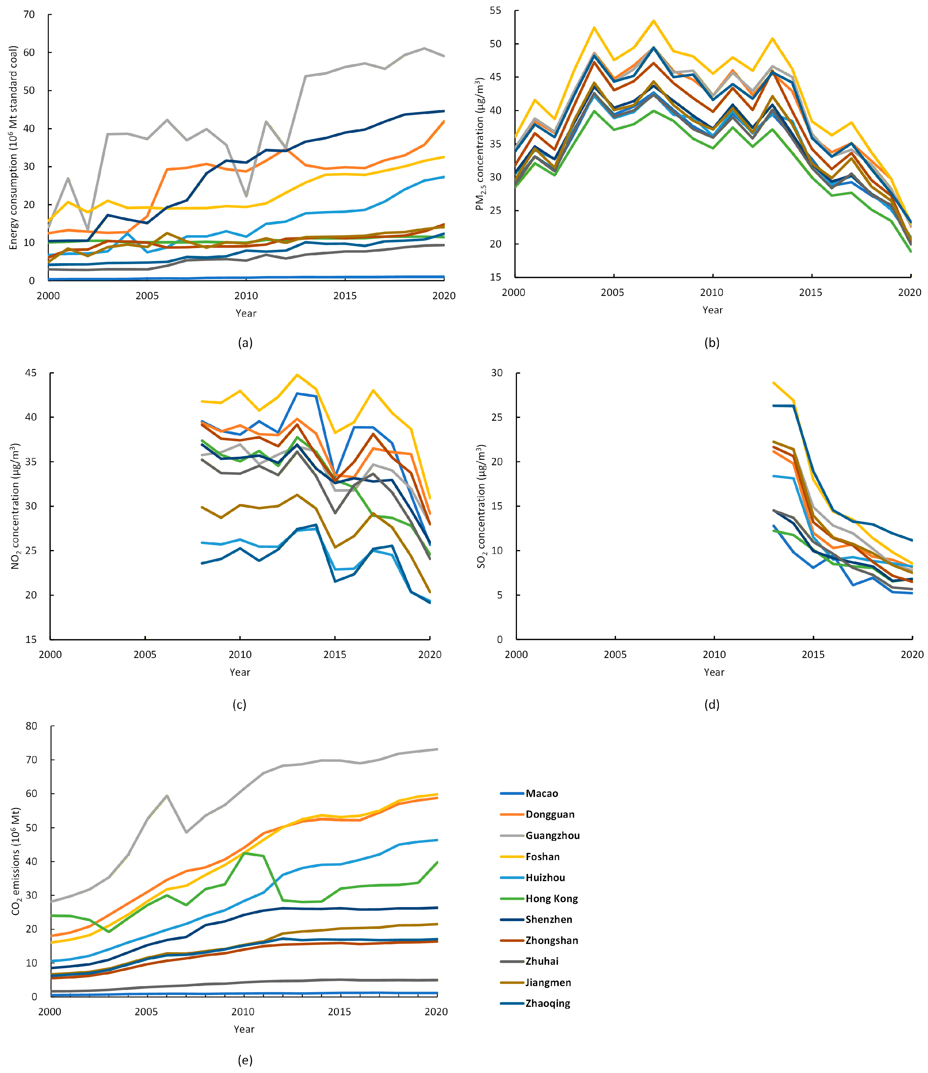 - Zhou, Y.; Li, K.; Liang, S.; Zeng, X.; Cai, Y.; Meng, J.; Shan, Y.; Guan, D.; Yang, Z. Trends, drivers, and mitigation of CO2 emissions in the Guangdong–Hong Kong–Macao Greater Bay Area. Engineering 2023, 23, 138–148. [Google Scholar] [CrossRef]