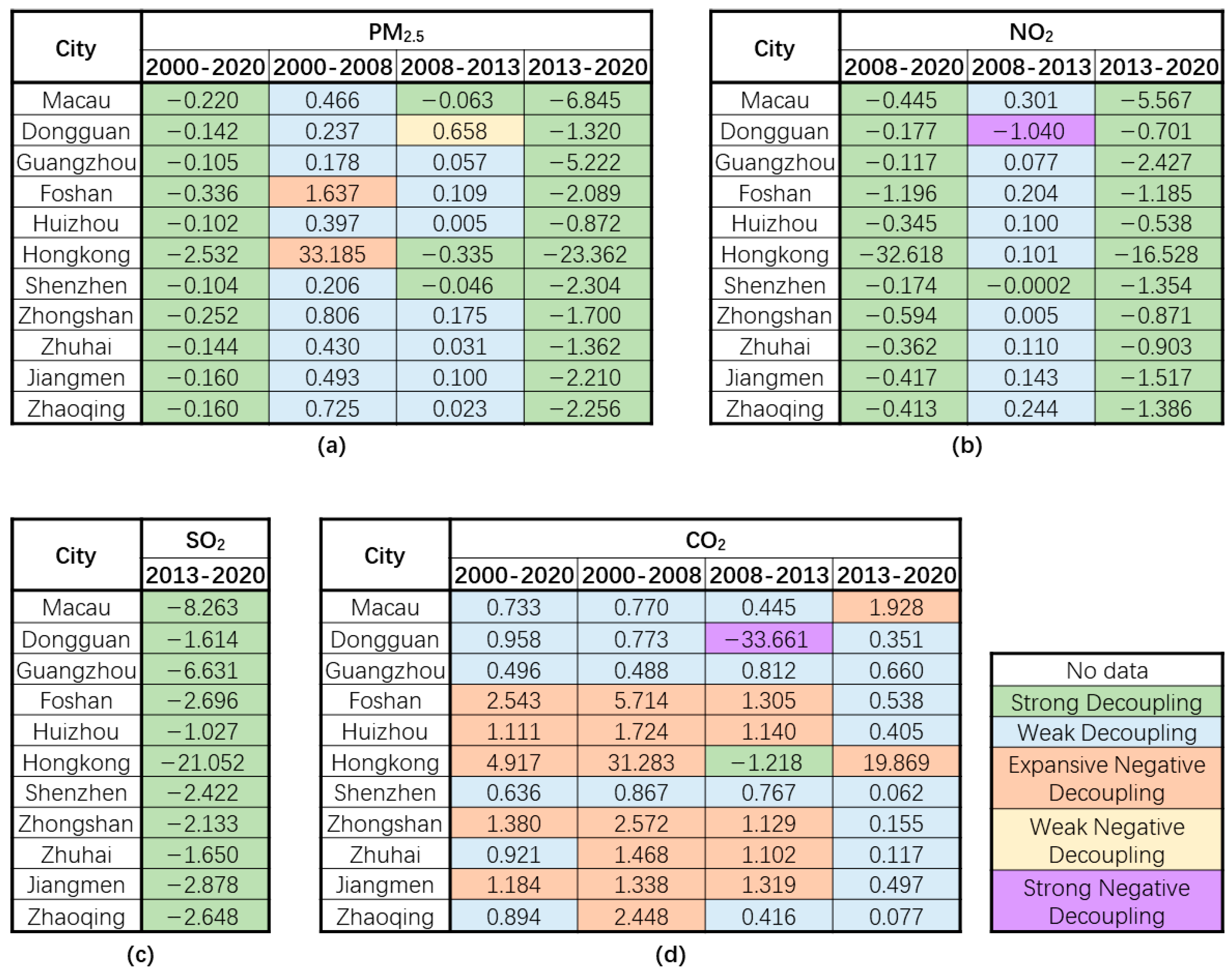 - 2008–2013: Marked by intensified environmental policies, this period saw improved air quality outcomes. While PM2.5 maintained weak decoupling patterns, some cities achieved strong decoupling as concentrations began declining. NO2 demonstrated emerging weak decoupling from energy consumption, signaling progress in vehicular emission controls. However, although the GBA also shows a positive trend in carbon emission control, the progress is relatively slow and further efforts are still needed.