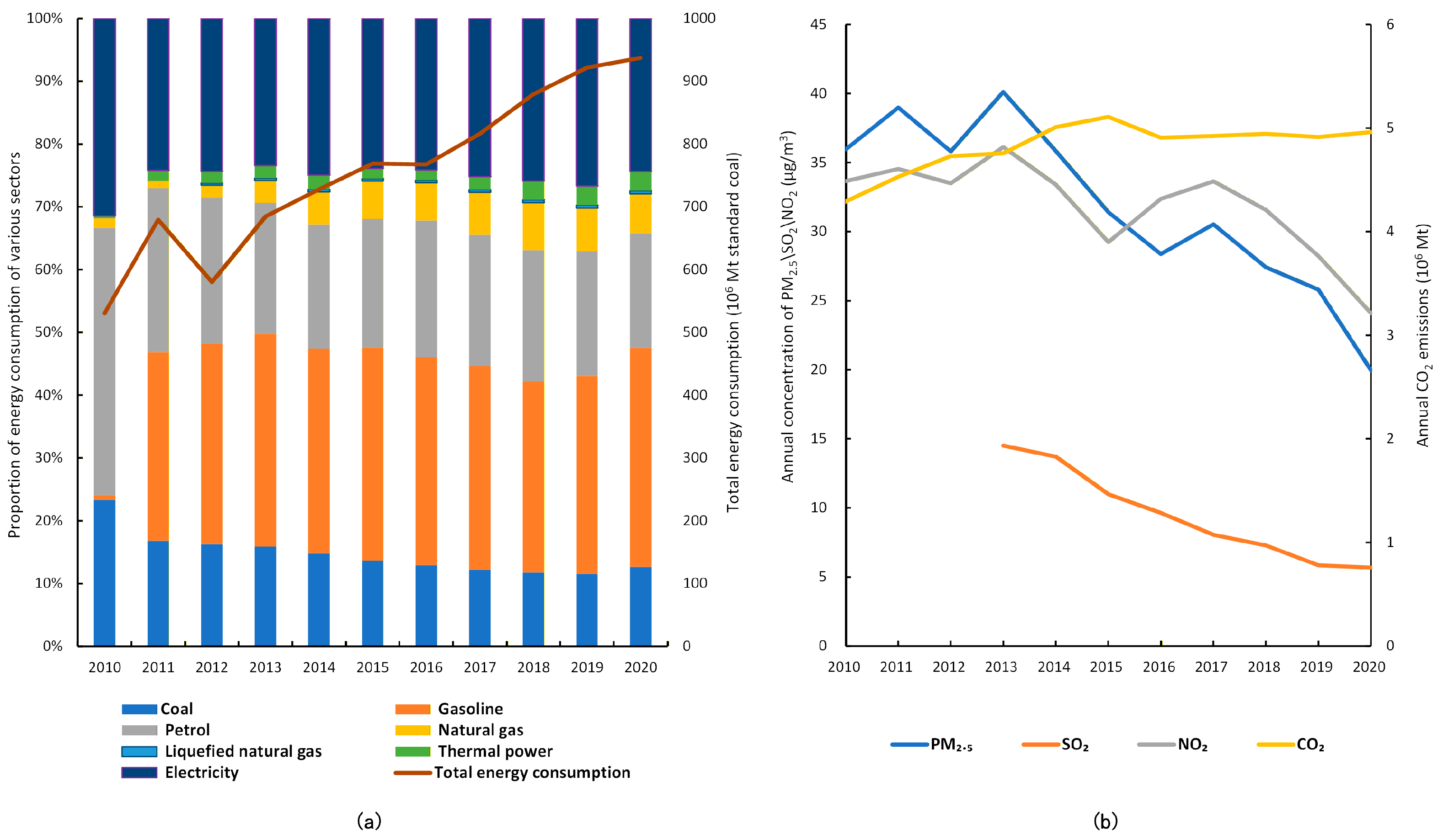 5.2. Energy Structure–Atmospheric Environment Relationship Based on a Representative City (Zhuhai)