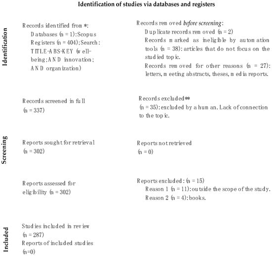 Although methodological recommendations generally highlight the need to search multiple databases to maximize the comprehensiveness of systematic reviews, this study relied exclusively on the Scopus database for the initial identification of records. This decision was grounded in the previous described reasons and in evidence showing that, in certain domains and clearly delimited research questions, a single database can retrieve most relevant studies, with only marginal gains resulting from the addition of further sources [21,22]. Prior research also demonstrates that specific bibliographic databases offer superior and consistent coverage across various fields, supporting pragmatic decisions to reduce the number of sources when adequately justified [23]. Moreover, rapid review guidelines acknowledge that, under time or resource constraints, streamlined strategies, including searching a single database combined with complementary mechanisms, are methodologically acceptable, if transparency and active bias mitigation are ensured [24]. To minimize potential omissions, complementary backward and forward citation-chasing strategies were performed, which are recognized in the literature as effective in retrieving studies not captured in the initial electronic search [25,26]. Nonetheless, we acknowledge that relying on a single database introduces a selection bias, particularly given that the search was restricted to studies published in English. Therefore, we recommend that future updates expand the search to additional databases and gray literature to strengthen the robustness and comprehensiveness of the synthesis [21,24]. Complementing the review protocol, keywords in English were defined and used, as it is the universal language of the academic and scientific community. The search used the following query: TITLE-ABS-KEY (“well-being” AND innovation AND organization) AND (LIMIT-TO (SUBJAREA, “SOCI”) OR LIMIT-TO (SUBJAREA, “BUSI”)) AND (LIMIT-TO (DOCTYPE, “ar”) OR LIMIT-TO (DOCTYPE, “re”)) AND (LIMIT-TO (LANGUAGE, “English”)). The screening process was conducted by two independent reviewers. Screening began after achieving at least 75% agreement between reviewers in a pilot test applied to a sample of ten articles to ensure consistency in the application of the criteria. In case of discrepancies, a third reviewer was consulted to resolve conflicts.