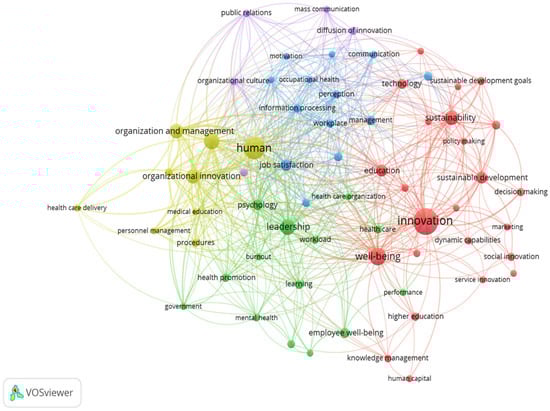 Thematic groups emerged from this recognition: (1) Innovation and well-being (Cluster 1, red); (2) Leadership pathways to workplace well-being (Cluster 2, green); (3) Work motivation and job satisfaction (Cluster 3, blue); (4) Human-centered management in technological progress (Cluster 4, yellow); and (5) Organizational culture (Cluster 5, purple). In the subsequent sections, each of these clusters is examined in detail, with a focus on the predominant themes, conceptual patterns, and key findings of the studies grouped within each cluster. This allows for a comprehensive understanding of how the literature in each thematic domain has evolved and how these domains collectively inform the broader field.