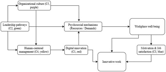 The proposed model reflects an emerging theoretical framework, supported by the thematic convergence of studies, but lacks validation in longitudinal, experimental, or methodologically triangulated research. Leadership pathways (C2, green) and organizational culture (C5, purple) emerge in the literature as factors consistently associated with the psychosocial mechanisms of work—particularly the balance between resources and demands—and appear related to the promotion of human-centered management practices (HCM; C4, yellow). Human-centered management, in turn, is often described as a framework that guides quality, equity, and the pace of change, coinciding with organizational environments where digital innovation develops (C1, red). Digital innovation emerges in the analyzed studies as an element that relates both to psychosocial characteristics of work (e.g., autonomy, clarity, cognitive load) and to different forms of innovative work. Psychosocial mechanisms, in this context, are frequently identified as intermediary elements that articulate the associations between leadership, organizational culture, innovation, and well-being in the workplace. Similarly, well-being appears linked to two sets of outcomes: (i) direct associations with innovative behaviours and (ii) indirect associations via motivation and job satisfaction (C3, blue). Finally, the studies also describe a reciprocal relationship, suggesting that higher levels of innovative work tend to coexist with greater motivation and satisfaction, configuring a cycle interpreted in the literature as a cumulative process that can sustain innovative behaviour over time.