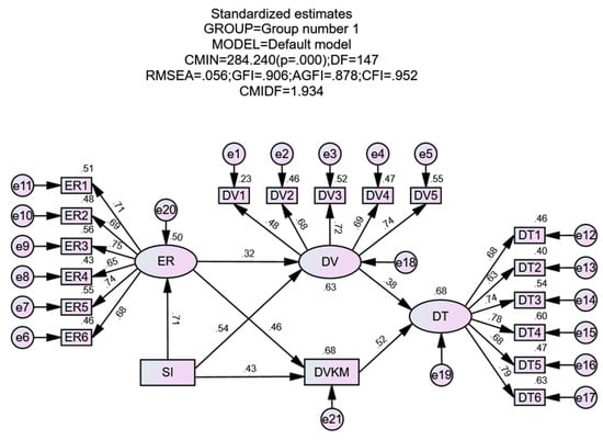 A questionnaire was developed for data collection (see Appendix A). All variables were measured using a 5-point Likert Scale, with items ranging from 1 (Strongly Disagree) to 5 (Strongly Agree). Employee resilience was measured by six items adapted from [44]. Digital transformation was measured by six items (six dimensions: strategy, business model, technology, organization and processes, culture, and customer interface) developed based on [25,26,27]. Data variation was measured using five items (five dimensions: accuracy, completeness, consistency, timeliness, and validity) developed based on [3,38,39,40,41,42]. System integration was measured by five items (five dimensions: information technology integration, human–machine integration, business integration, human-organization integration, and internal and external firm integration) developed based on a literature review and expert consultation. Digital variation knowledge management was measured by six items adapted from [43], which have been validated in knowledge management research. The average values of the SI and DVKM scales were used as observed variables in SEM for three reasons: (1) Observability: Based on enterprise interviews and expert suggestions, the items of the SI and DVKM scales are consistent in measuring their respective constructs and can directly reflect the actual situation of the variables. They are observable and do not require treatment as latent variables. (2) Good construct validity and measurement reliability of both SI and DVKM scales: Their exploratory factor analysis (EFA) and reliability analysis results were satisfactory—each scale yielded a single factor (all item loadings > 0.65; KMO > 0.8; cumulative variance explained > 50%) and demonstrated good internal consistency (CTIC > 0.4; item-deleted Cronbach’s α < overall Cronbach’s α; overall Cronbach’s α > 0.75). (3) Reduction in SEM measurement noise: Average values offset random errors of individual items, reduce parameters to estimate, and improve model fit [49].