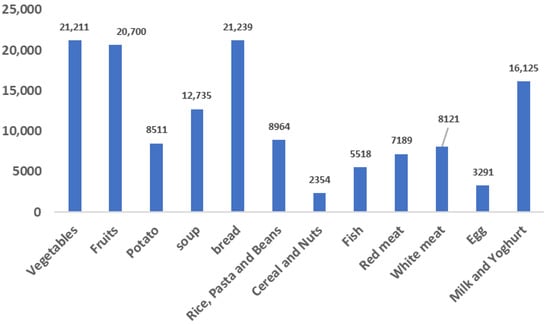 Figure 1 presents the distribution of household food waste by weight across the 12 food categories. Vegetables (21,210.71 g), bread (21,239.10 g), and fruits (20,700 g) represent the largest quantities of food waste generated by Irish households. These high amounts are likely driven by spoilage, perishability, and frequent consumption of these items. Other substantial contributions include milk and yogurt (16,124.90 g) and rice, pasta, and beans (12,735.40 g). In contrast, eggs (3291.43 g) and cereal and nuts (2354.29 g) account for the lowest quantities of waste, reflecting their longer shelf life and greater stability during storage.