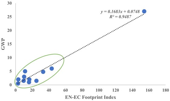 Figure 3 demonstrates a strong linear relationship between the EN-EC Footprint Index and Global Warming Potential (GWP), as evidenced by an R2 value of 0.94. This high correlation suggests that increasing the environmental and economic footprint (EN-EC) leads to a significant rise in GWP, which is consistent with studies showing that integrated footprint analyses are effective in predicting climate impacts. For instance, Ref. [31] highlight that combining environmental metrics with economic assessments is crucial in identifying major drivers of GHG emissions across food systems.