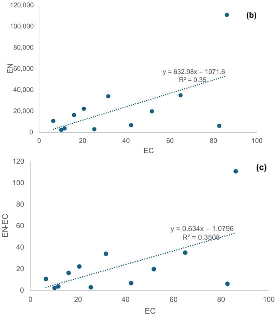 General linear relationship between: (a) Environmental impact (EN) and economic cost (EC); (b) Environmental impact (EN) and EN-EC Footprint Index; (c) Economic cost (EC) and EN-EC Footprint Index.