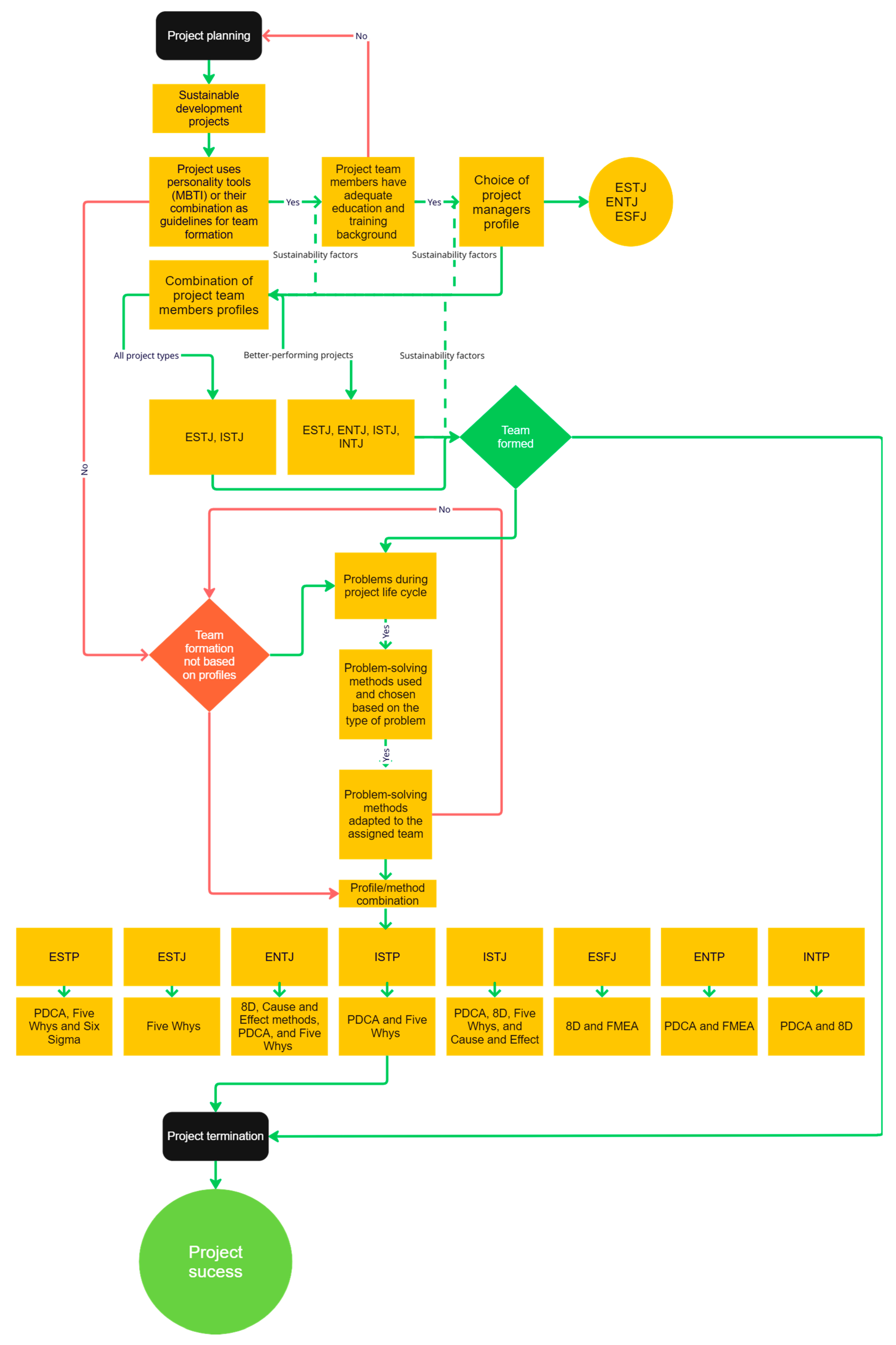 | Project success | Impact of personality tools and problem-solving methods during project life cycle on termination of projects with success | 22 | 5-point Likert scale | Teams created based on personality tools can help project managers to achieve greater success on projects. Using the right team members (team members with certain profiles) to help solve problems can increase the chances of successful realization of projects. Sharing the results (knowledge sharing) of the solved problems can help achieve project goals with success. | [13,14,35,61,67,68] |