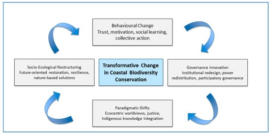 This review demonstrates that transformative change in coastal biodiversity conservation is both urgently needed and increasingly recognized as a central pathway to address accelerating ecological crises. The synthesis of 134 studies reveals that transformation does not occur through linear or isolated processes but instead emerges from the interplay of governance innovation, behavioral transformation, socio-ecological restructuring, and paradigmatic shifts in human–nature relationships. While each pathway provides critical leverage points, their combined operation highlights the complexity of coastal systems as dynamic, adaptive, and politically contested arenas.