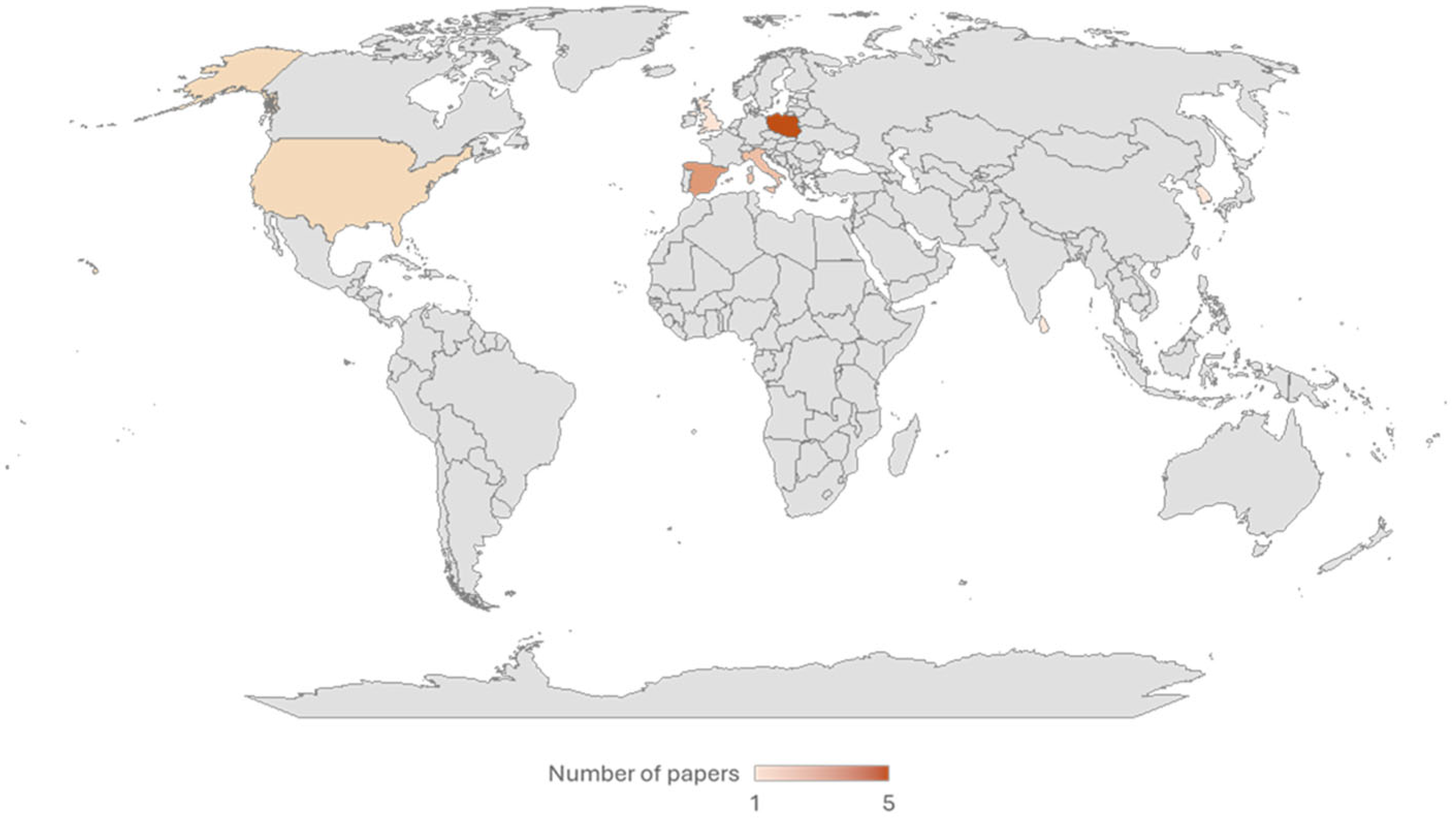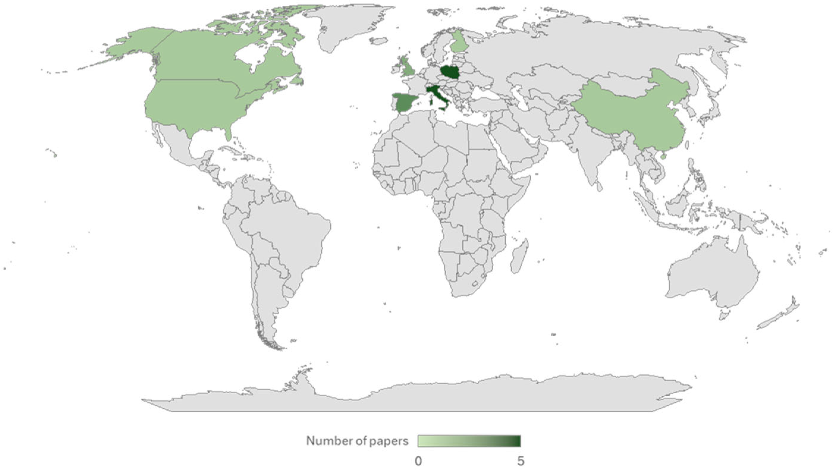 The countries affiliated with the authors of the published papers are illustrated in