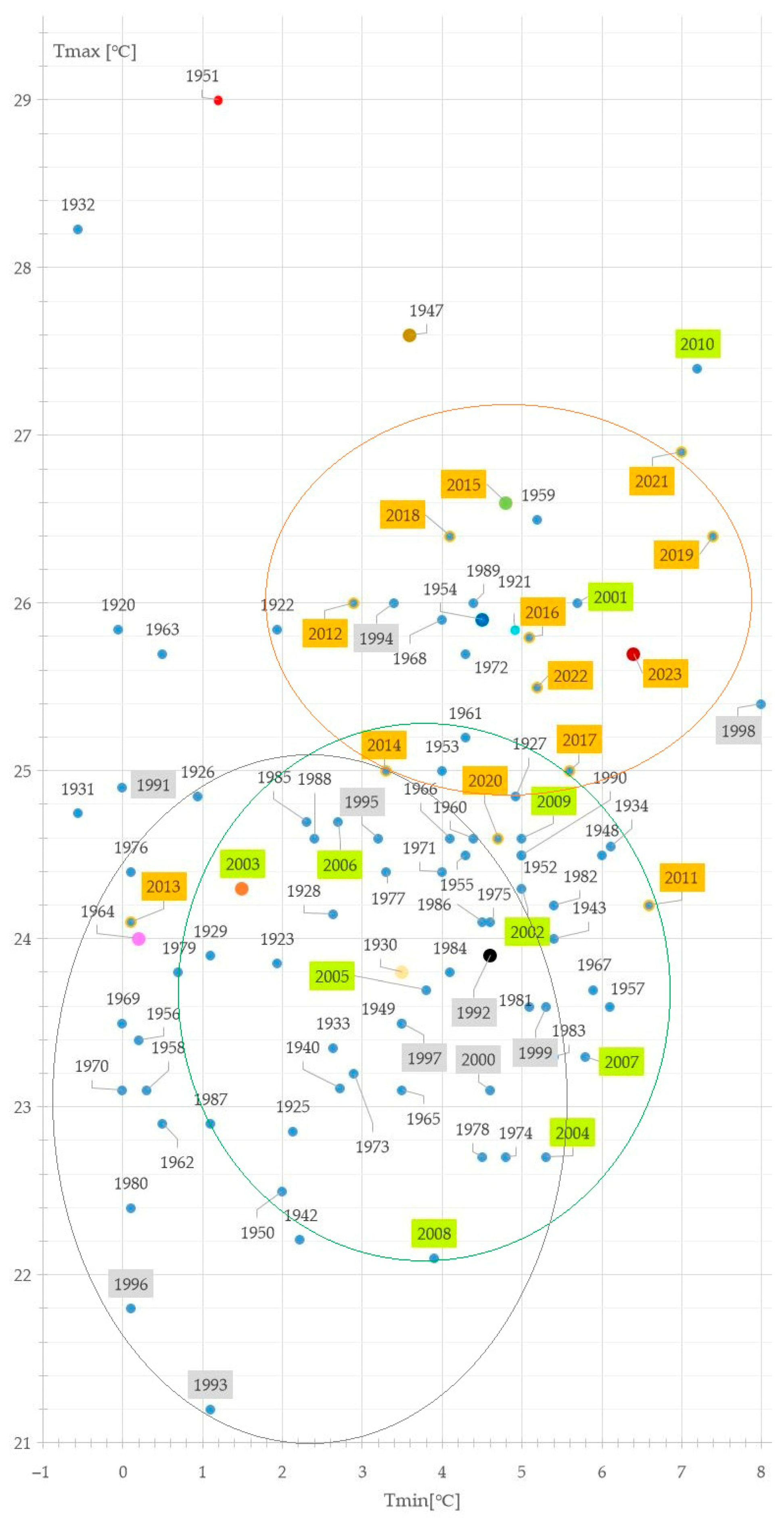 | Tav.n | Tmax,n | Tmin,n | Date of Tmax,n | Date of Tmin,n | ||