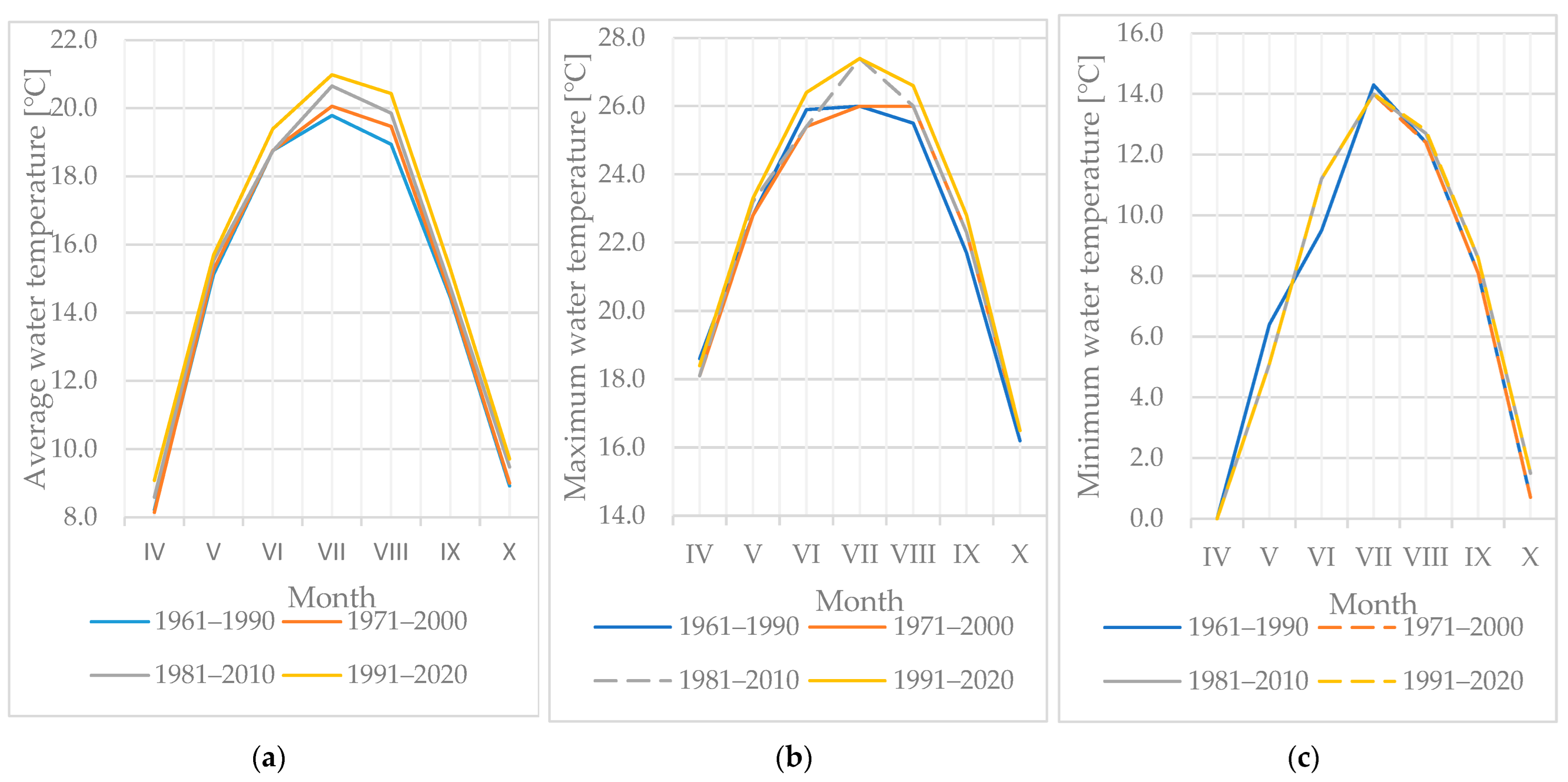 3.2. Characteristics of Maximum, Minimum, and Average Water Temperatures