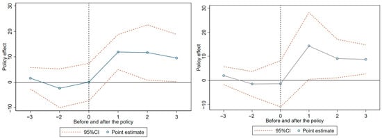 Results of the parallel trend test. Notes: The horizontal axis denotes the years relative to the NAO audit of SOEs (0 = audit year, −3 = 3 years before audit, 3 = 3 years after audit); the vertical axis denotes the coefficient of the audit dummy variable.
