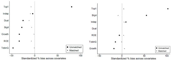 When using DID analysis to evaluate national auditing, selection bias may exist between the treatment group and control group, potentially leading to inaccurate test results. Therefore, this study uses PSM-DID for secondary verification. Propensity scores are calculated by a Logit model, which incorporates key control variables as covariates. Later, samples are matched in a 1:4 nearest neighbor matching approach. Before the PSM-DID test, the reliability of matching results must be ensured. As shown in Figure 3, each variable is far from the zero line before matching, while after matching, they are relatively close, and all the absolute values of standard error are less than 10%.