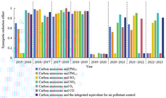 Based on the synergistic effect analysis model established in Section 3.2, the synergistic reduction effects between overall carbon emissions and multiple air pollutants in Chengdu are calculated, as detailed in Figure 2.