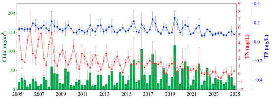 Long-term changes in water quality of Lake Taihu (seasonal averages with max–min ranges). The red and blue lines are concentrations of total nitrogen (TN) and total phosphorus (TP) of the whole lake; the green bar is the concentration of Chlorophyll-a (Chla). The data is from TLLER.