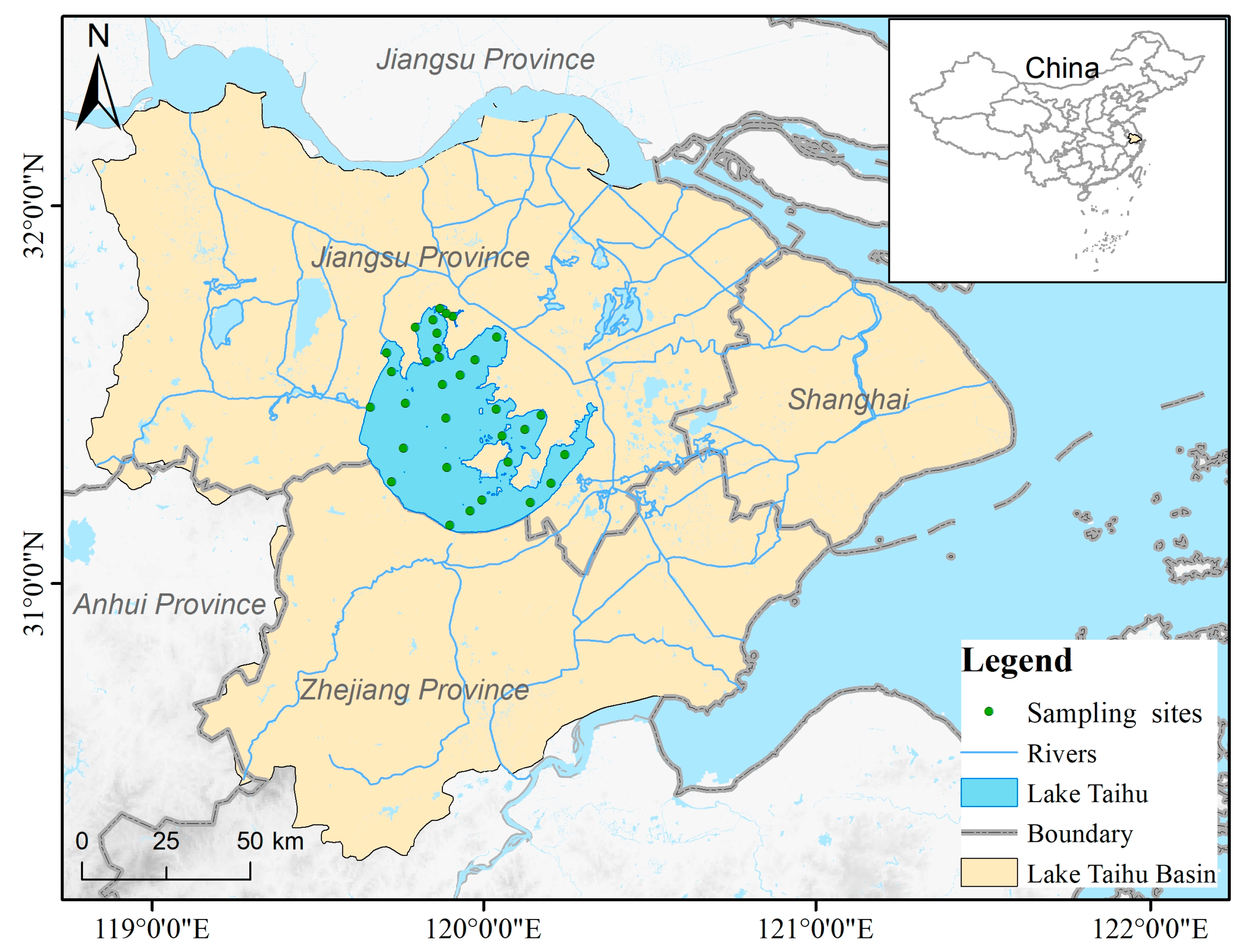 Lake Taihu, the third-largest freshwater lake in China, covers an area of 2336 km2 with a mean depth of less than 3m. Its basin (~36,500 km2) drains a heavily urbanized and highly industrialized region in the Yangtze River Delta that supports over 40 million inhabitants. Its 172 influent rivers form a complex network that integrates pollutant discharges from numerous cities, industrial clusters, and farmlands across multiple jurisdictions (Jiangsu, Zhejiang, and Shanghai), defining a fundamental governance challenge. Principal inflows from the western and southwestern mountainous areas, deliver 60–80% of its total annual input (averaging 88 × 108 m3) [8], while the main outflow discharges through the Taipu River in the east. Nutrient-rich wastewater discharges concentrated along the northern and northwestern lakeshores are trapped in the northwestern bay by prevailing southeasterly summer monsoon winds, enhancing local nutrient retention and intensifying cyanobacterial bloom formation [9]. Since the 1990s, this shallow nutrient-impacted lake has experienced accelerated eutrophication accompanied by toxic cyanobacterial blooms (Microcystis spp.), especially in its highly eutrophic northern region [6].