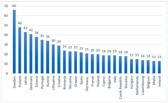 The latest data shows the share of RESs in total energy consumption in some EU-27 countries. According to statistics from Eurostat and the Central Statistical Office in Warsaw, Sweden is the EU leader in renewable energy use, with RESs accounting for 66% of its energy consumption in 2023. In the EU, countries such as Finland (48%), Latvia (43%), Denmark (41%), and Austria (34%) also show significant dependence on renewable energy. Estonia (38%) and Lithuania (30%) perform better than the EU-27 average, showing significant progress in adopting RESs. However, Poland and France remain below the EU average, with renewable energy accounting for only 27% of their gross energy consumption [42,43,44]. Figure 1 provides a visual representation of these trends and illustrates the context of the share of renewable energy in EU countries. This creates a basis for analyzing the use of RESs in various sectors, including healthcare.