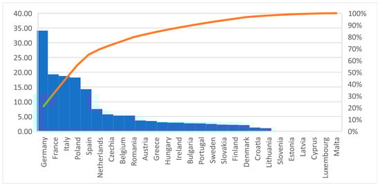 Figure 2 presents a Pareto analysis of healthcare-related greenhouse gas emissions across EU countries. The graph clearly highlights the potential of Germany, France, Italy, Poland, and Spain to use renewable energy in healthcare facilities to improve environmental sustainability. The chart illustrates greenhouse gas (GHG) emissions attributable to healthcare facilities in EU countries, which account for 5% of total GHG emissions in each country. Greenhouse gas emissions related to healthcare are relatively high. This reflects the significant dependence on fossil fuels in the energy mix, including in the healthcare sector, which contributes to increased emissions. Countries such as the Netherlands, the Czech Republic, Belgium, and Romania have significantly lower emissions. Meanwhile, countries such as Malta, Luxembourg, and Cyprus have negligible emissions, probably due to their smaller healthcare infrastructure and higher rates of renewable energy use.