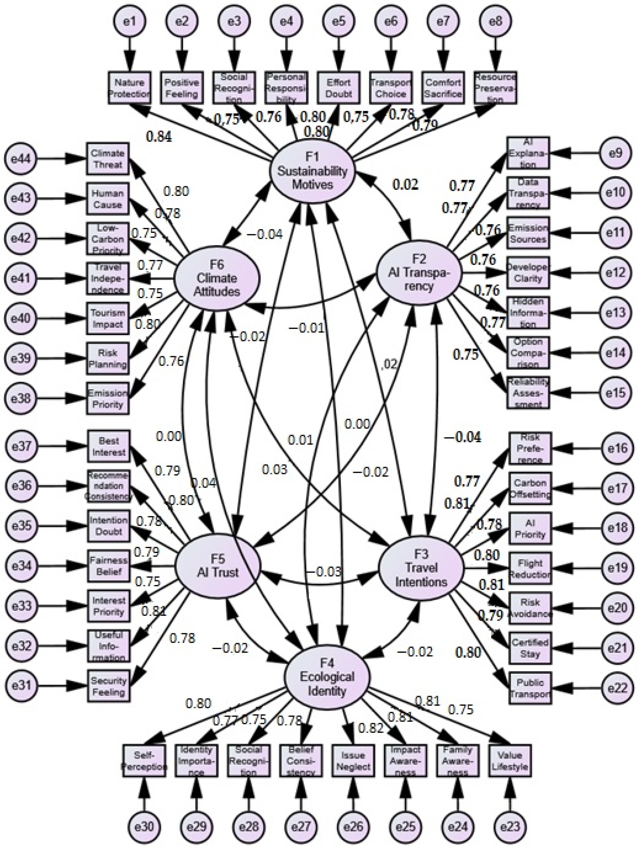 The initial pool of 56 items was subjected to exploratory factor analysis. Based on factor loadings, cross-loadings, and internal consistency, 12 items were removed, resulting in a refined set of 44 items with clean loadings on six latent dimensions. To enhance measurement precision, the removal of items followed explicit and transparent psychometric criteria. First, six items demonstrated low communalities (<0.40) and consistently weak factor loadings (<0.50) across preliminary EFA solutions, indicating insufficient shared variance with their intended constructs. Second, four items exhibited substantial cross-loadings (>0.30) on two or more factors, preventing a clean factor structure and introducing conceptual ambiguity. These items were theoretically redundant with stronger-performing items and were therefore removed to preserve construct purity. Finally, two items showed low corrected item–total correlations and conceptual misalignment during pretesting, suggesting they did not meaningfully contribute to their theoretical domains. The decision to remove items was thus driven by established psychometric standards rather than attempts to inflate model fit. Importantly, all constructs retained full content validity because each removed item had a conceptually parallel item with stronger performance, ensuring that the breadth of each construct remained intact. These dimensions—sustainability motives, AI transparency, sustainable travel intentions, ecological identity, trust in AI, and climate attitudes—were subsequently confirmed through confirmatory factor analysis. All constructs demonstrated convergent and discriminant validity. This validated measurement model formed the basis for the structural model used in SEM analyses.