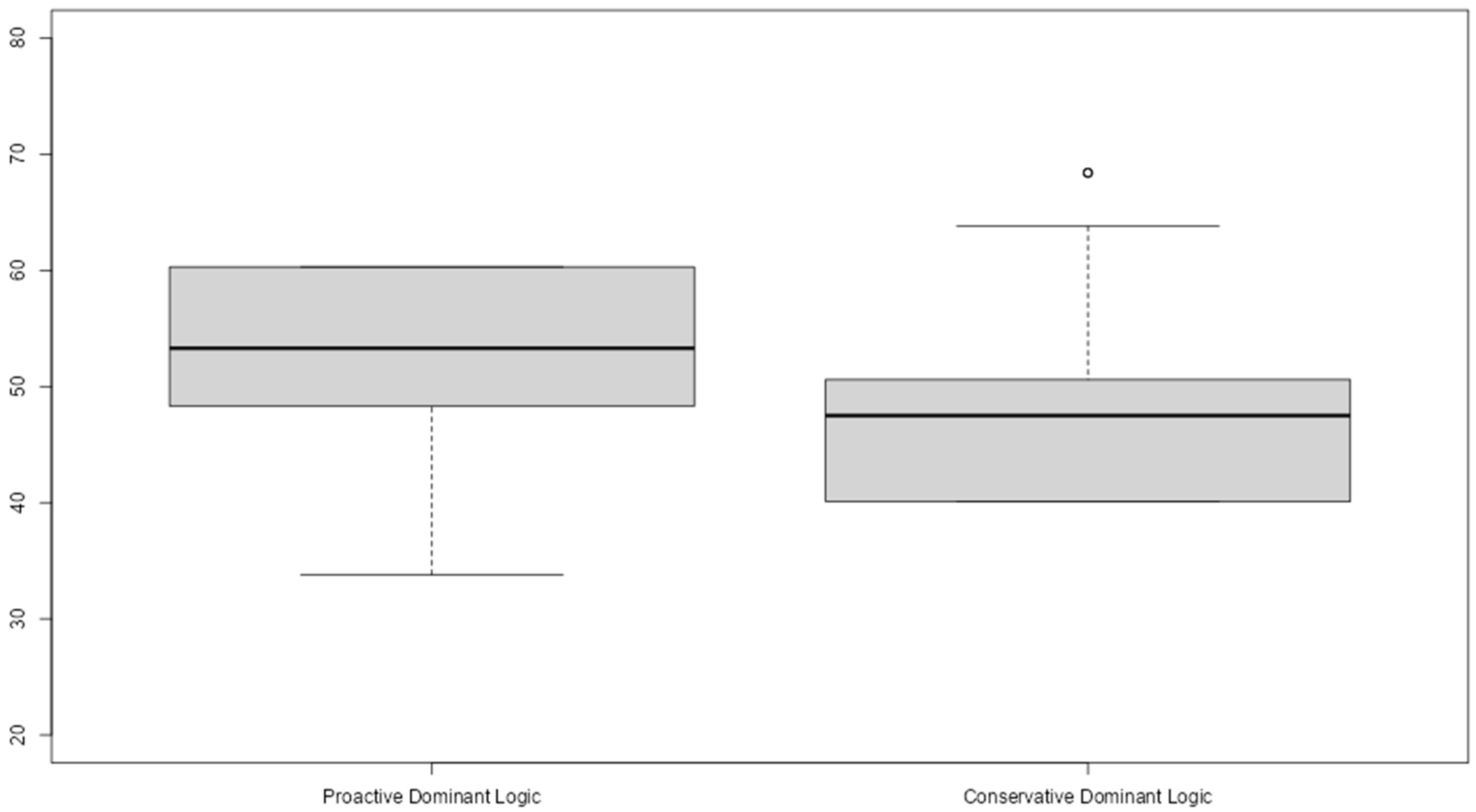 p < 0.001), which means that high scores in proactive dominant logic are associated with high scores in strategic diversification. However, the relationship between proactive dominant logic and strategic vision dominance is not statistically significant at the 0.05 level (