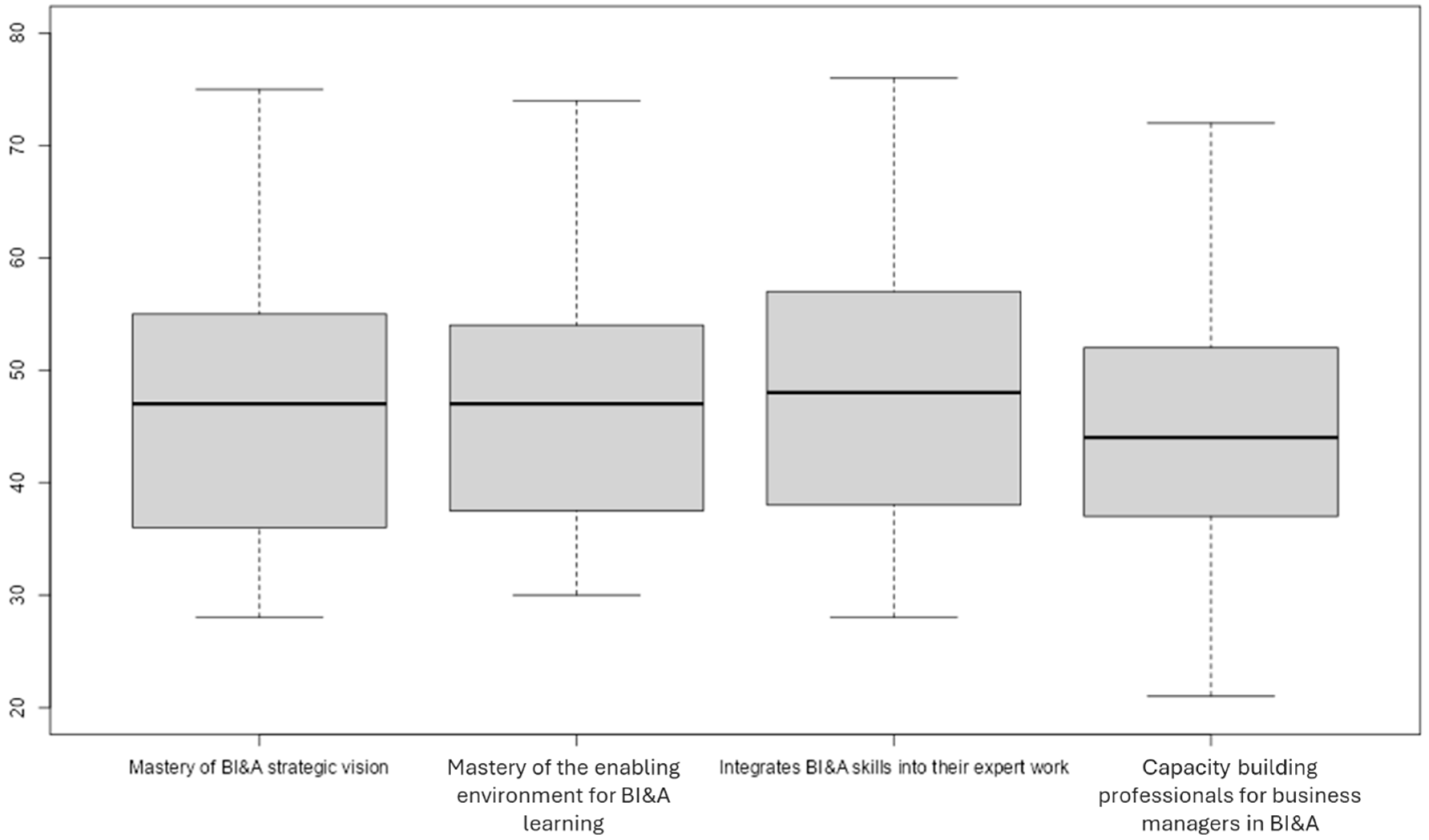 Referring to BI&A competencies, the majority of the evaluated workers show moderate consolidation in the four competencies: BI&A strategic vision, mastery of the enabling environment for BI&A learning, integration of BI&A skills into their expert work, and Capacity building professionals for business managers in BI&A.