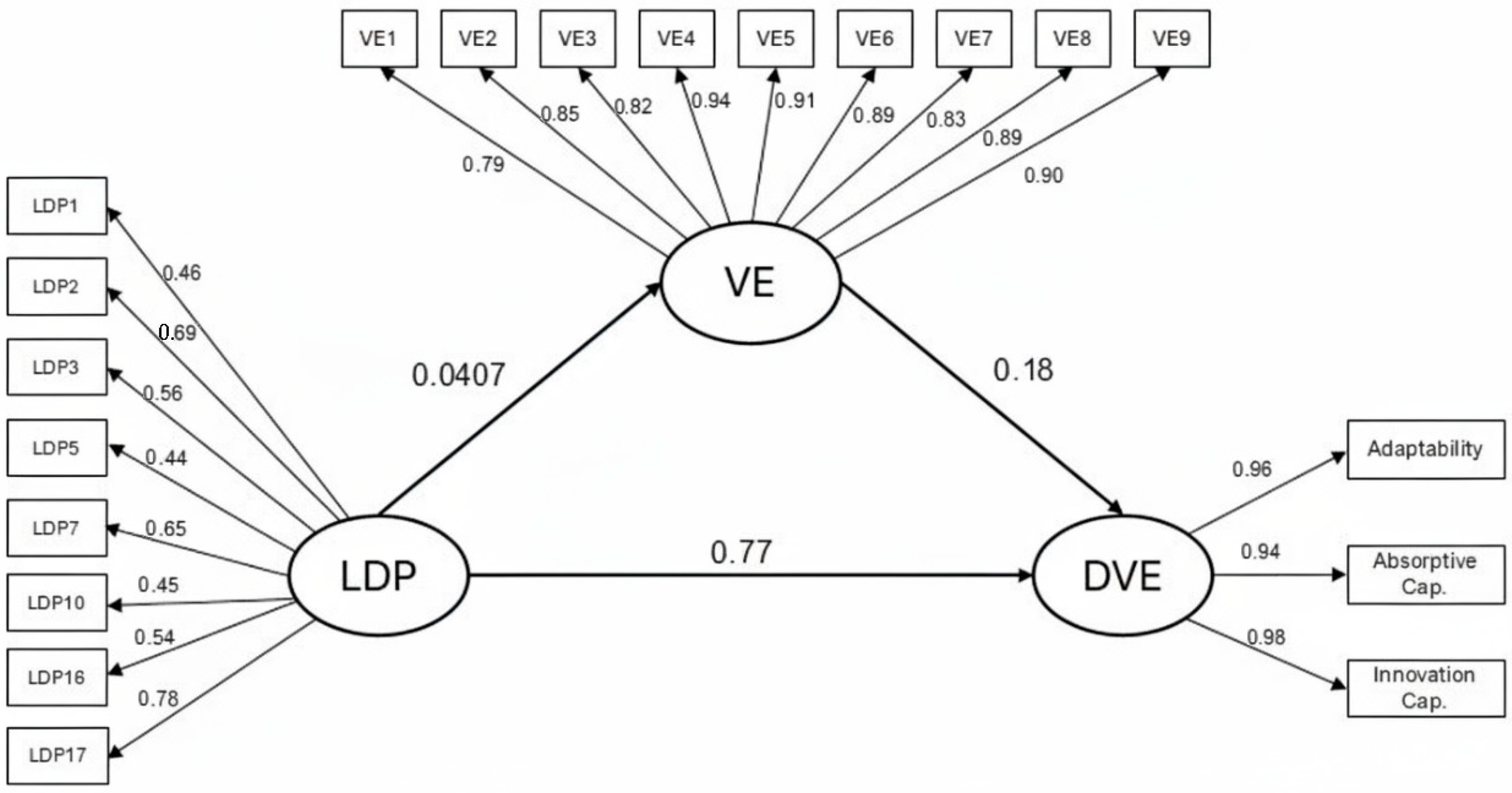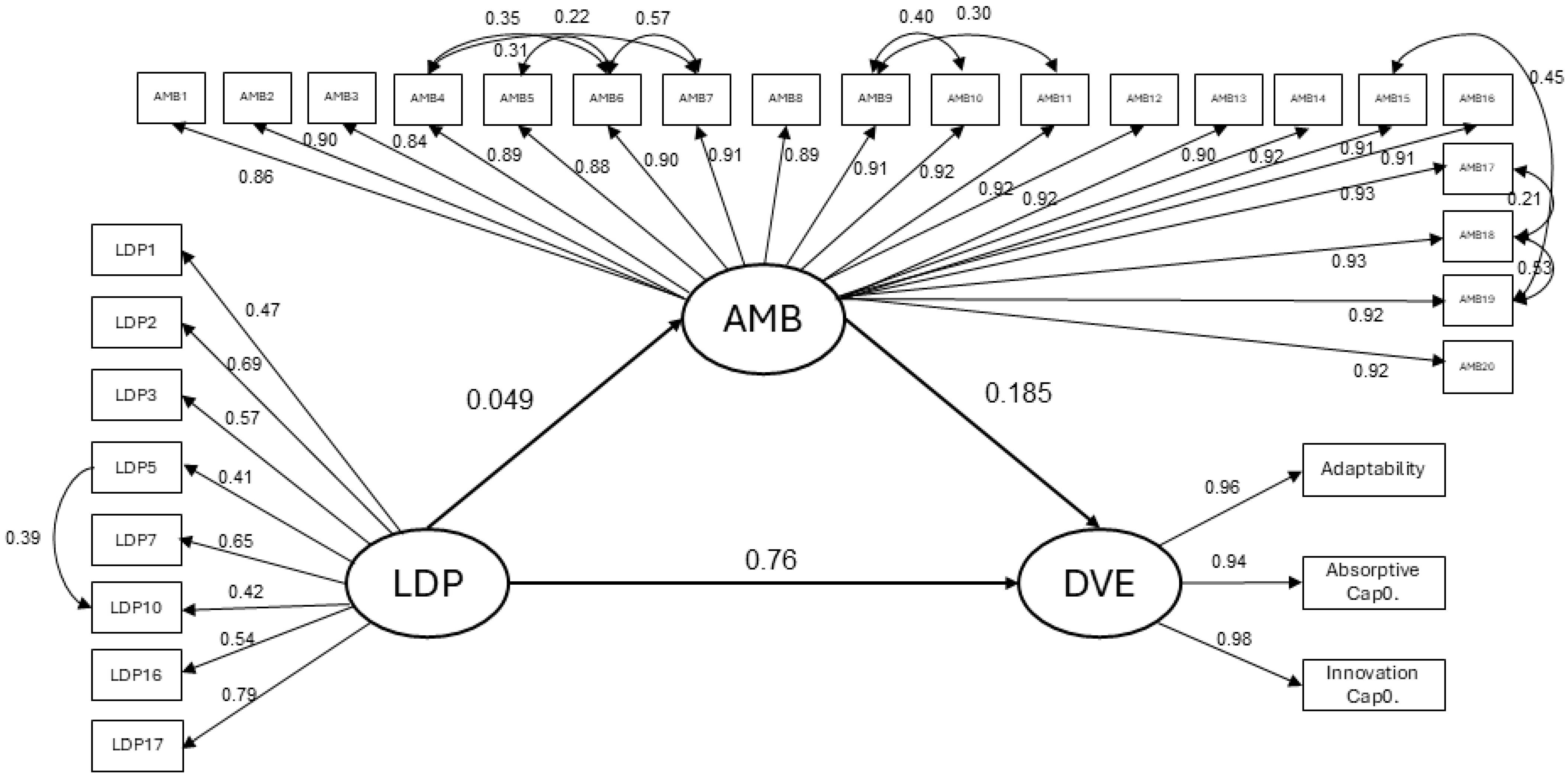 58], who propose the use of standardized effect sizes and robust estimators to refine theoretical models. The absence of statistically significant indirect effects in this study could reflect contextual limitations in the development of BI&A within SMEs, or it may indicate that managerial cognitive frameworks exert a more direct influence on strategic behavior in resource-constrained environments.
