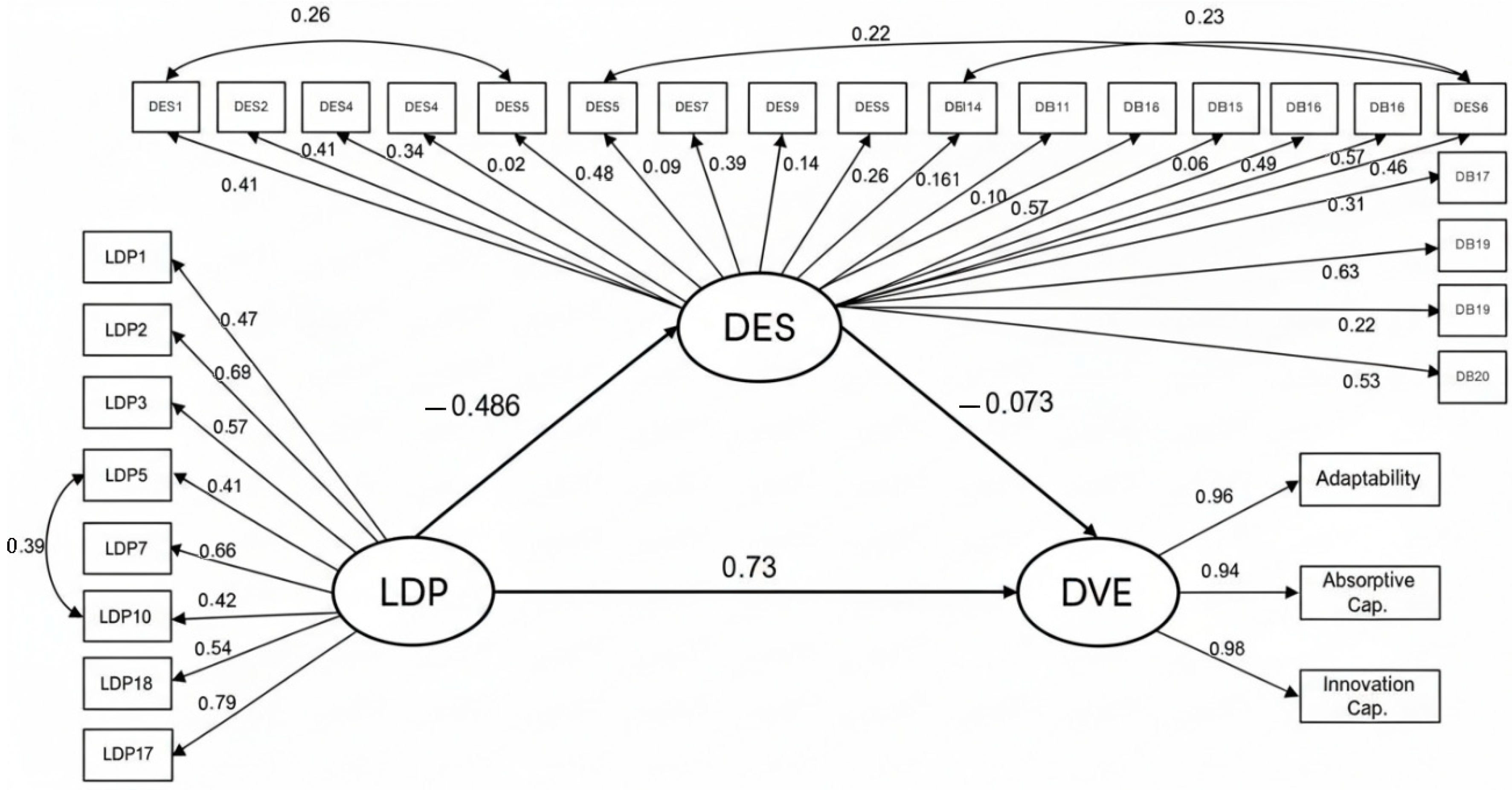The relationship between proactive dominant logic and professional skills development for business managers in BI&A is moderate, negative, and statistically significant (β = −0.486, p < 0.001), which means that high scores in proactive dominant logic are associated with low scores in professional skills development for business managers in BI&A. On the other hand, the relationship between this last variable and strategic diversification is not statistically significant (β = −0.073, p = 0.256).
